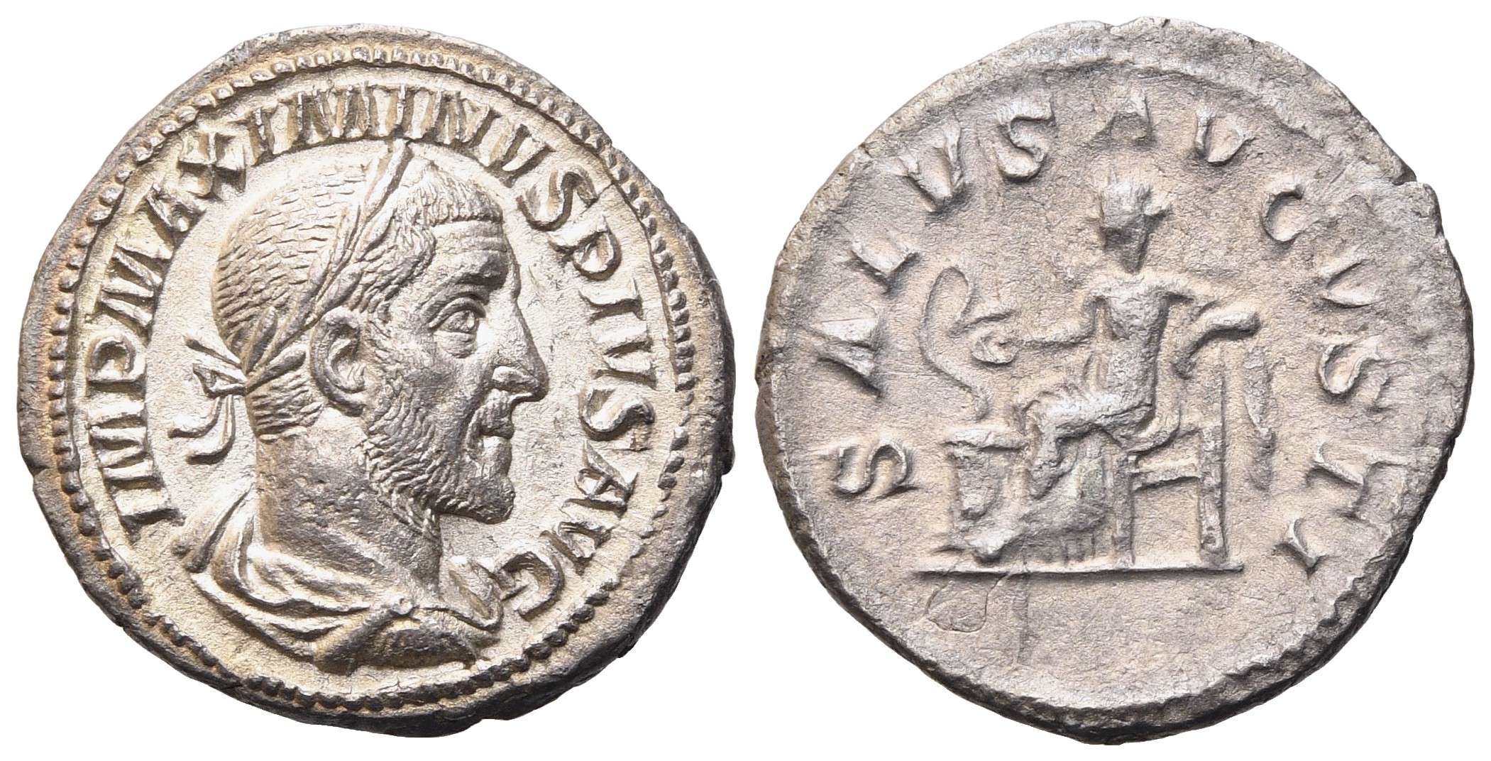 IMP MAXIMINVS PIVS AVG Laureate, draped and cuirassed bust of Maximinus I to r.; Rv. SALVS AVGVSTI Salus seated l., feeding from patera a serpent rising from altar. RIC 14; Sear 8316; RSC 85a. Extremely fine / good very fine.
