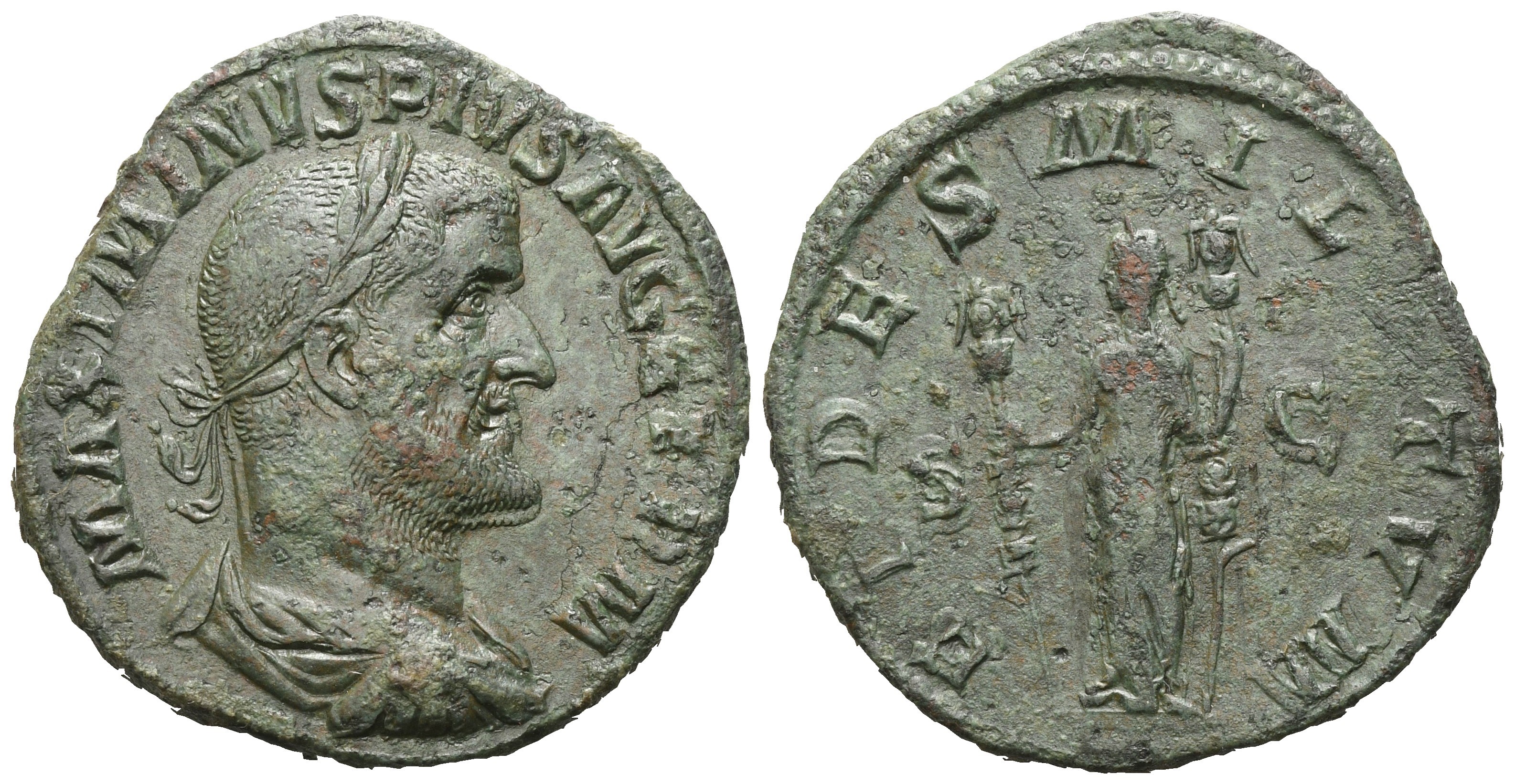 MAXIMINVS PIVS AVG GERM, laureate, draped and cuirassed bust of Maximinus I to r.; Rv. FIDES MILITVM, S-C, Fides standing l. holding two standards. RIC 78; Cohen 13. Dark grey-green patina. Expressive portrait. Good very fine.