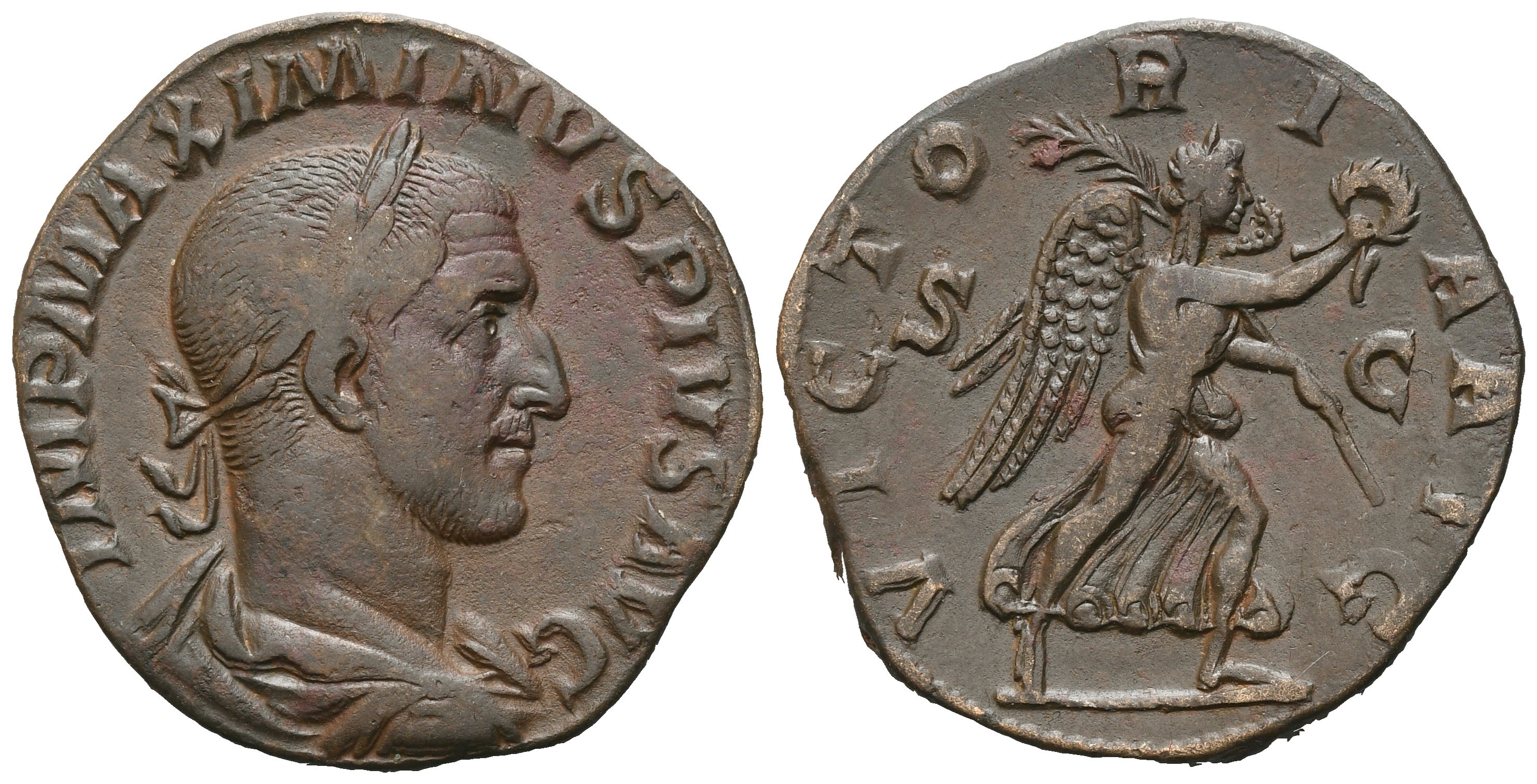 IMP MAXIMINVS PIVS AVG Laureate, draped and cuirassed bust r.; Rv. VICTORIA AVG S-C, Victory advancing right bearing wreath and palm. RIC 67; C. 100, BMC 108. Reddish brown patina. Extremely fine.