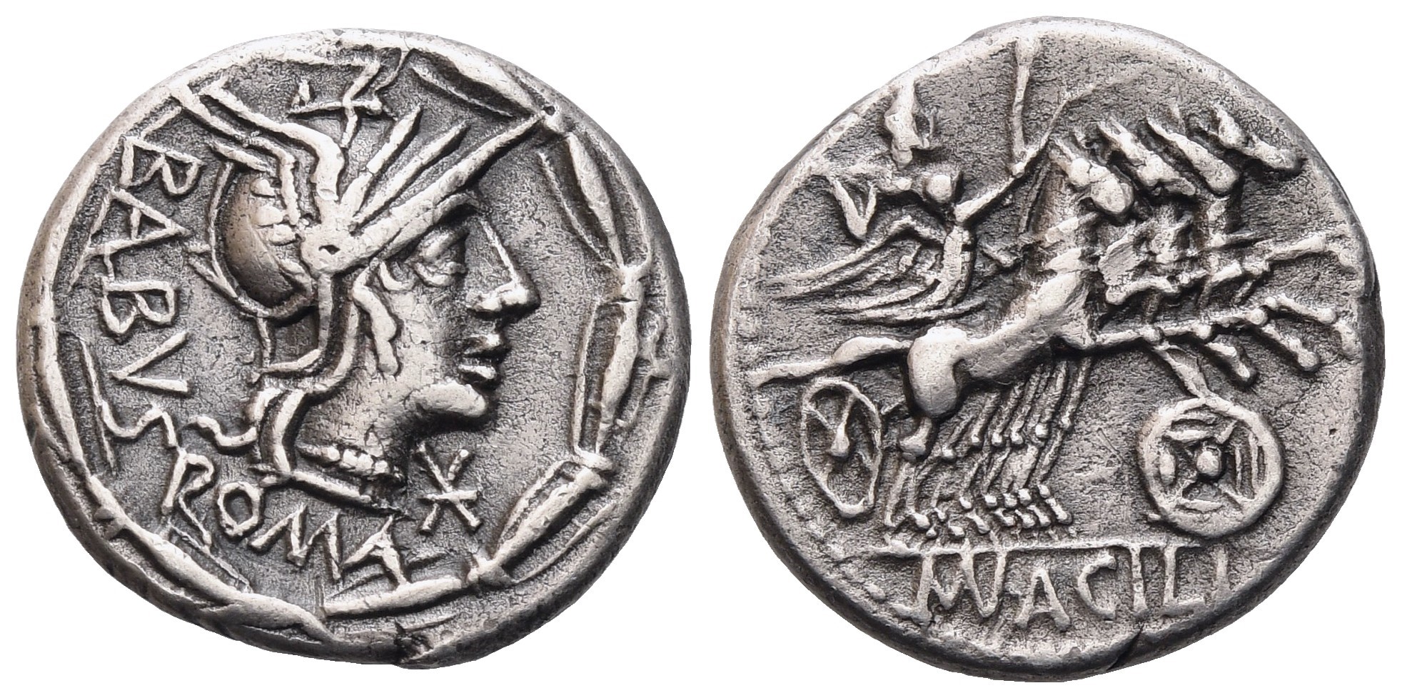 Helmeted head of Roma facing r., * (mark of value) below chin; BALBVS behind head, ROMA below; Rv. Jupiter, holding sceptre and thunderbolt, riding quadriga driven by Victory, who holds reins and whip, shield below, M·ACILI in exergue. Crawford 271/1; Babelon (Acilia) 4; Sydenham 498. Slight porosity, otherwise good very fine / about extremely fine.
