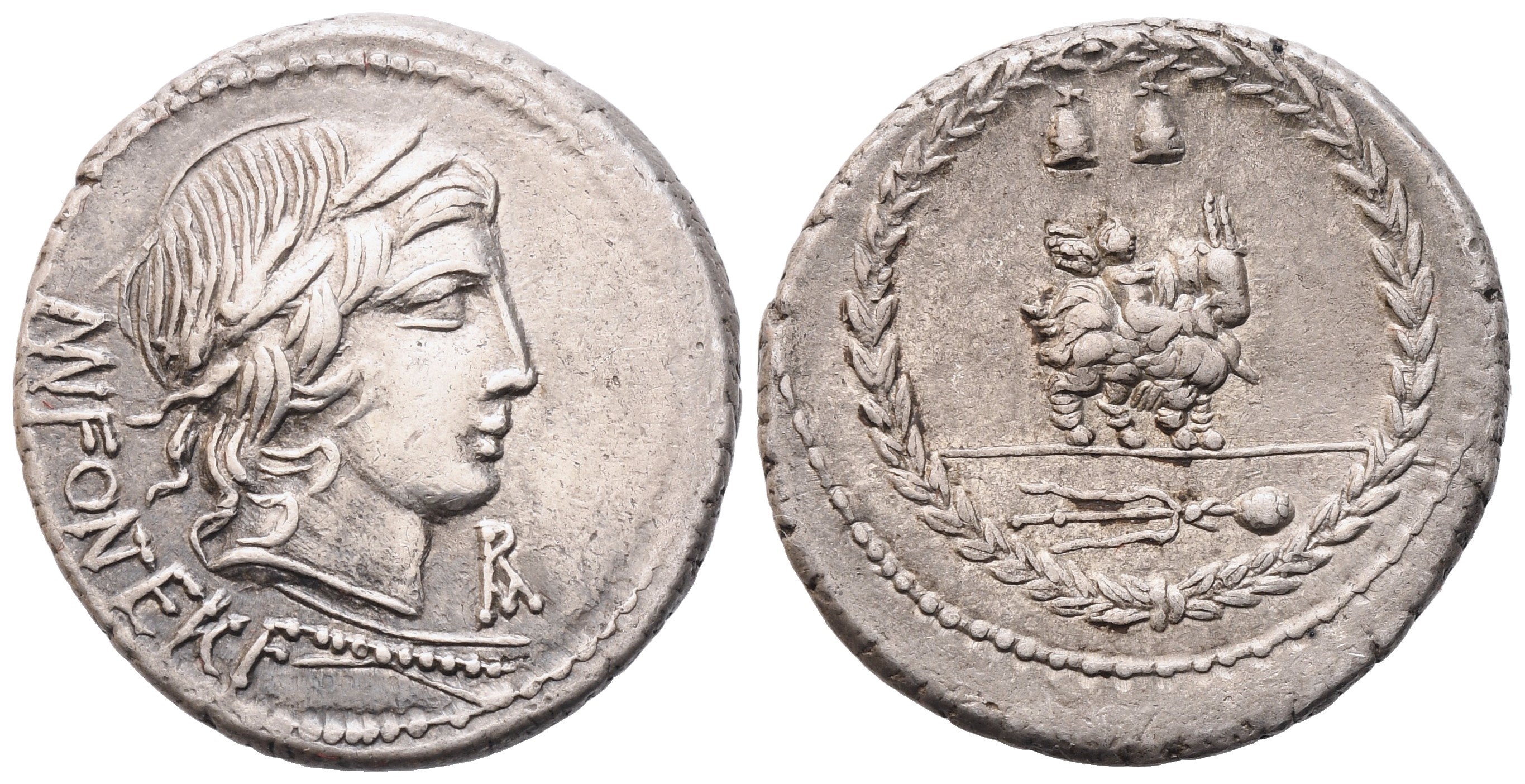 Laureate head of Vejovis (or Apollo) r.; M·FONTEI·C·F (NT ligate) downward to l., monogram below chin, thunderbolt below neck; Rv. Winged Genius (or Cupid) seated on goat, standing r.; pilei of the Dioscuri above, thyrsus with fillet in exergue; all within laurel wreath. Crawford 353/1a; Babelon (Fonteia) 9; Sydenham 724. Good very fine.