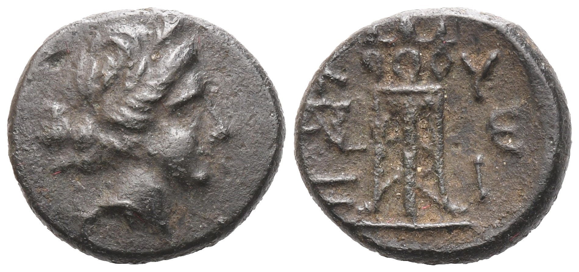 Head of Kore Soteira r.; Rv. Tripod. SNG BN 429 var. Dark brown patina. Good very fine.