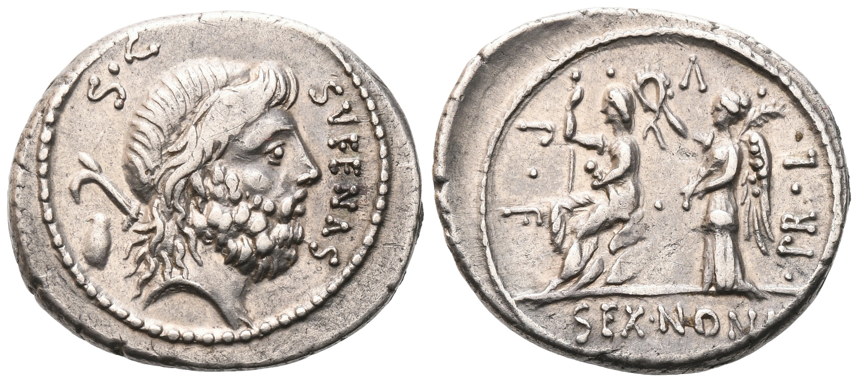 Head of Saturn r.; behind, harpa and conical stone; behind, S·C upwards; before, SVFENAS downwards; Rv. Roma seated l. on pile of arms, holding sceptre and sword, crowned by Victory standing behind her, holding palm-branch; around, anticlockwise, PR·L·V·P·F; in exergue, SEX·NONI. Crawford 421/1; Babelon (Nonia) 1; Sydenham 885. About extremely fine.