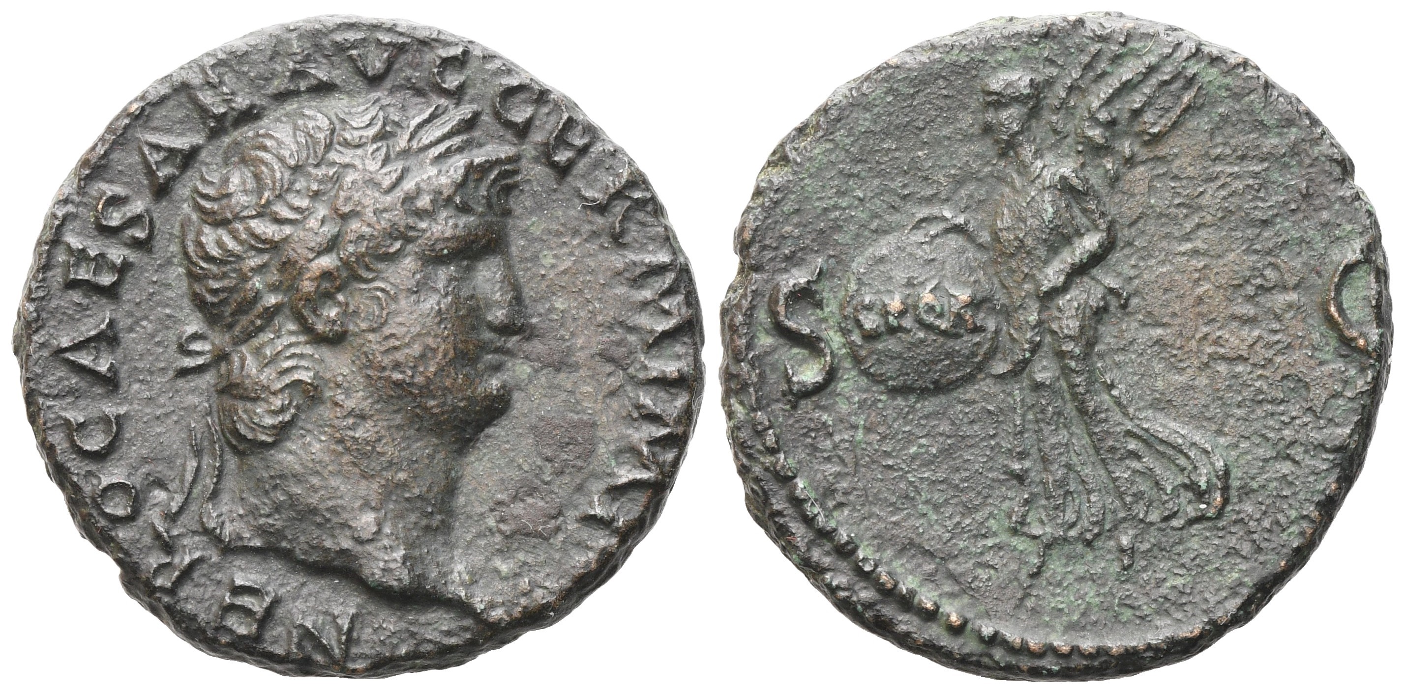 NERO CAESAR AVG GERM IMP Laureate head r.; Rv. Victory alighting to l., holding shield inscribed SPQR; S β C across fields. RIC 312; Cohen 288; BMCRE 241. Some roughness, otherwise gVF / VF