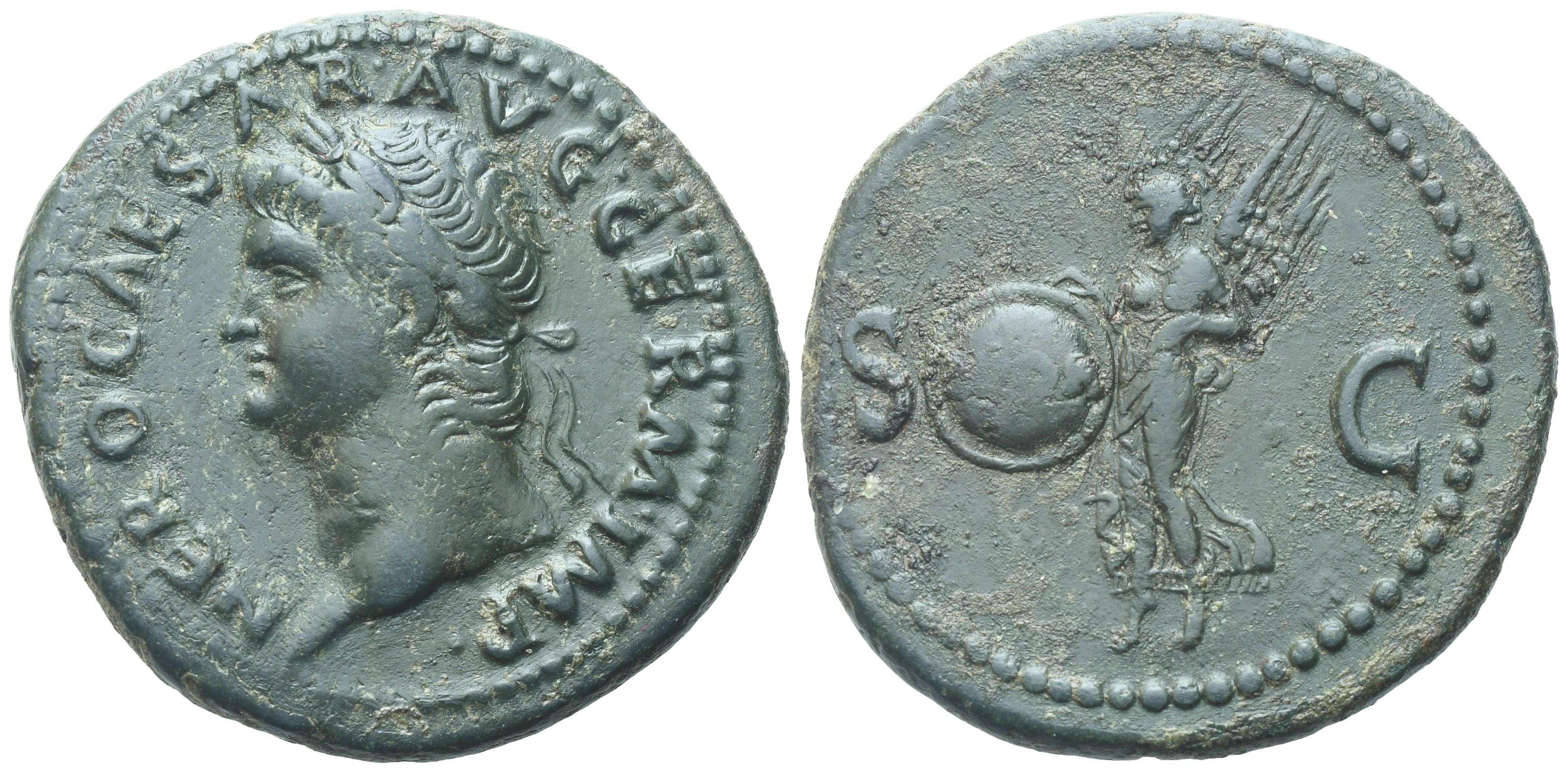 NERO CAESAR AVG GERM IMP Laureate head of Nero l.; Rv. S-C Victory l. with shield Lovely green patina. RIC 313; C 298, 289. Good very fine.