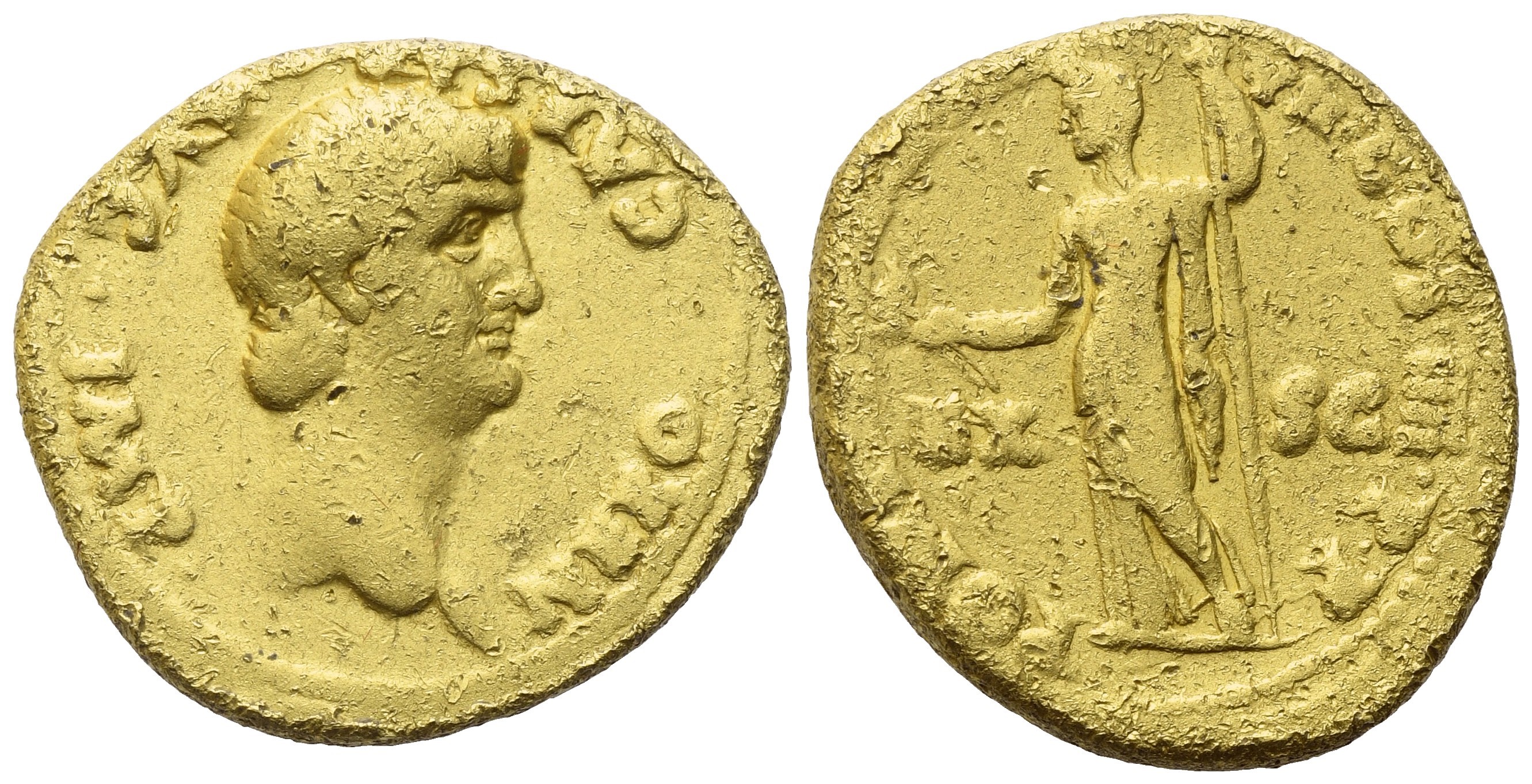NERO CAESAR·AVG IMP Bare head r.; Rv. PONT[IF MAX TR P] VII COS IIII P·P Virtus, helmeted and in military attire, standing l, holding parazonium and sceptre; r. foot on pile of arms; at his sides, EX – SC. C 219. B MC 27. RIC 25. CBN 36. Calicó 429. Good fine.