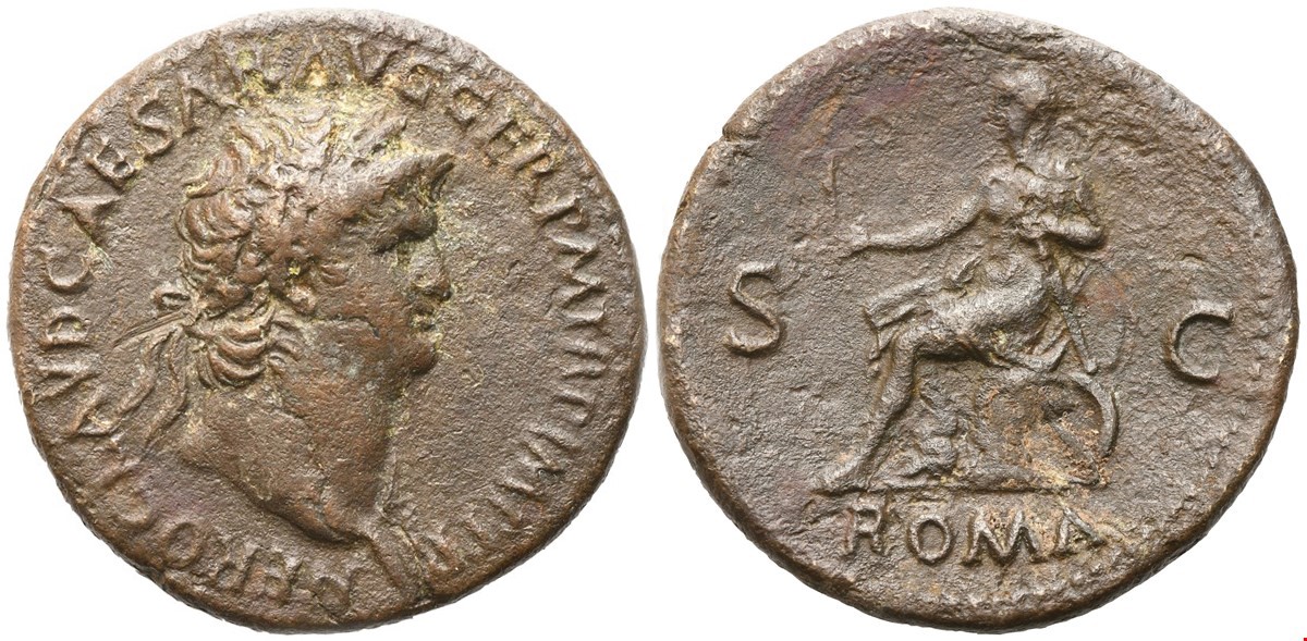 NERO CLAVD CAESAR AVG GER PM TRP IMP PP Laureate head r.; Rv. ROMA - S C Roma seated l. holding Victory and parazonium. RIC I² 398. Light brown patina. Good very fine.