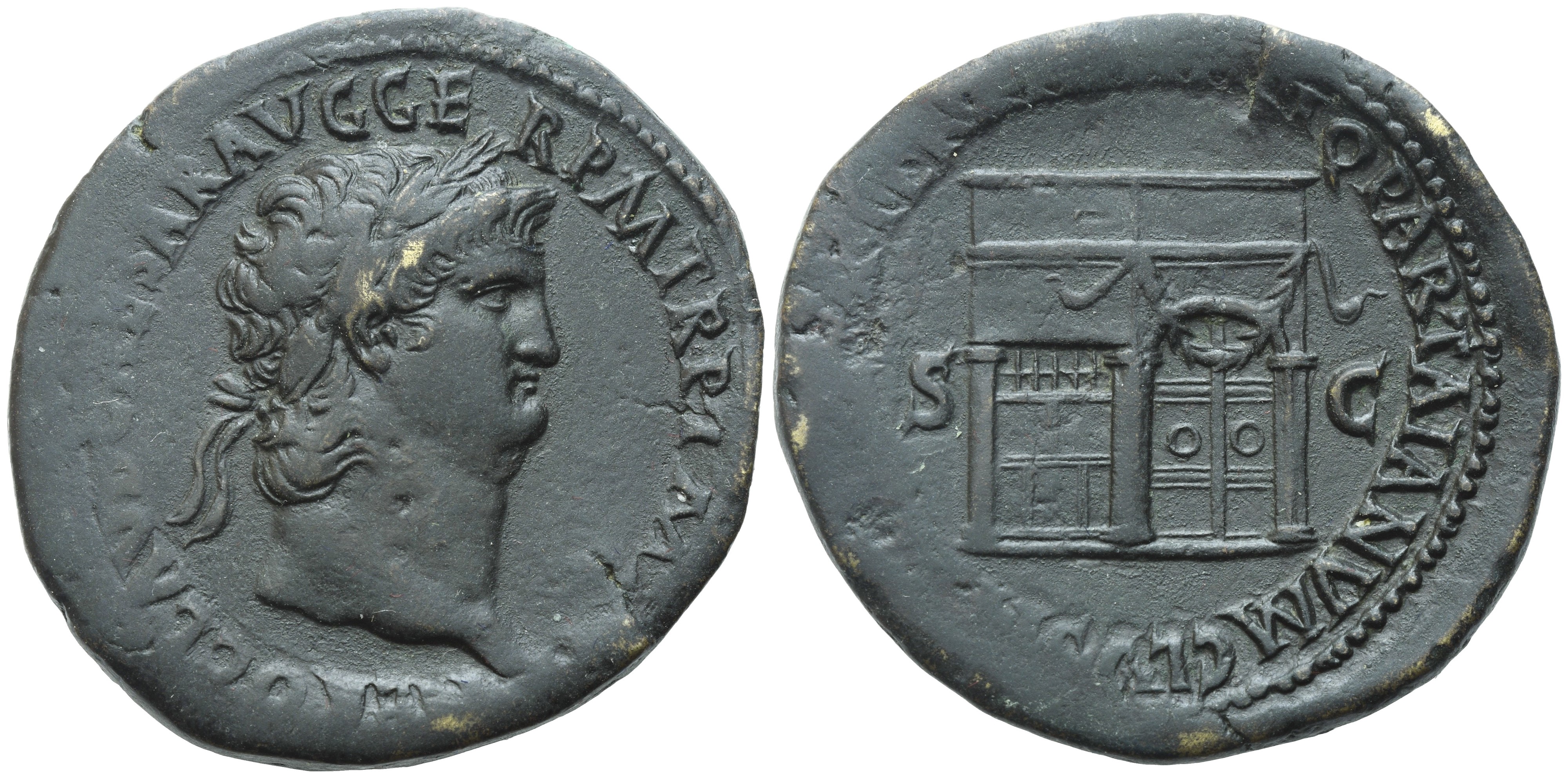 NERO CLAVD CAESAR AVG GER P M TR P IM[P P P Laureate head r.; Rv. PACE P R TERRA MARIQ PARTA IANVM CLVSIT / S - C, View of the Temple of Janus with front doors closed, garland draped across arched entrance. RIC 264; Cohen 145. Dark patina. Some areas of flatness, otherwise good very fine. Bold portrait.