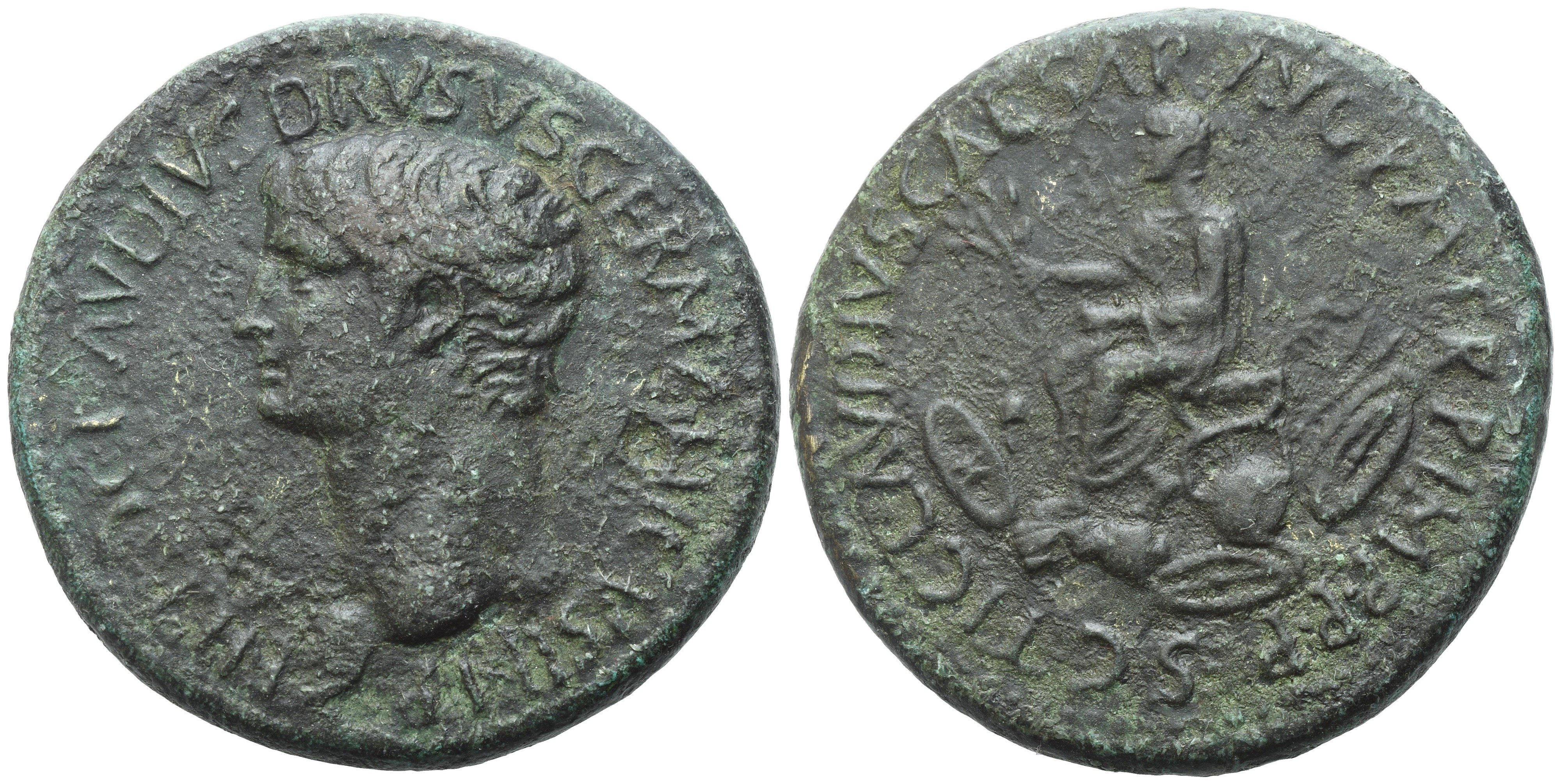 NERO CLAVDIVS DRVSVS GERMANICVS IMP Bare head l.; Rv. TI CLAVDIVS CAESAR AVG P M TR P IMP P P, Claudius togate, seated l. on curule chair, holding branch; miscellaneous weapons and armour lying around; below, S C. RIC 93; C 8. Dark green patina. Good very fine.