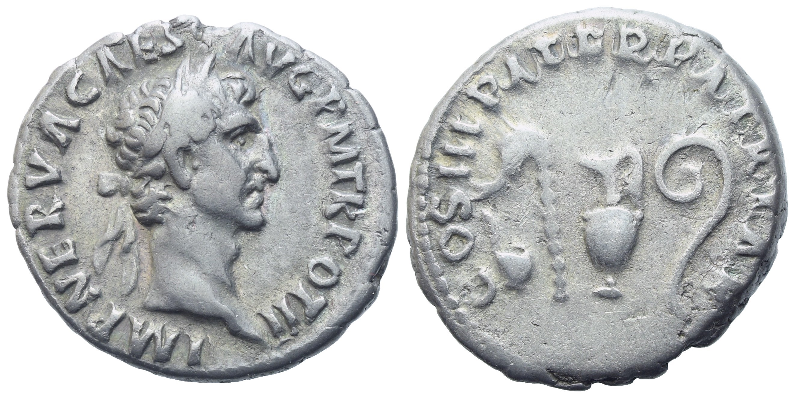 IMP NERVA CAES AVG P M TR POT Laureate head r.; Rv. COS III PATER PATRIAE Priestly emblems: simpulum, aspergillum, guttus, and lituus. RIC 24. Good very fine.
