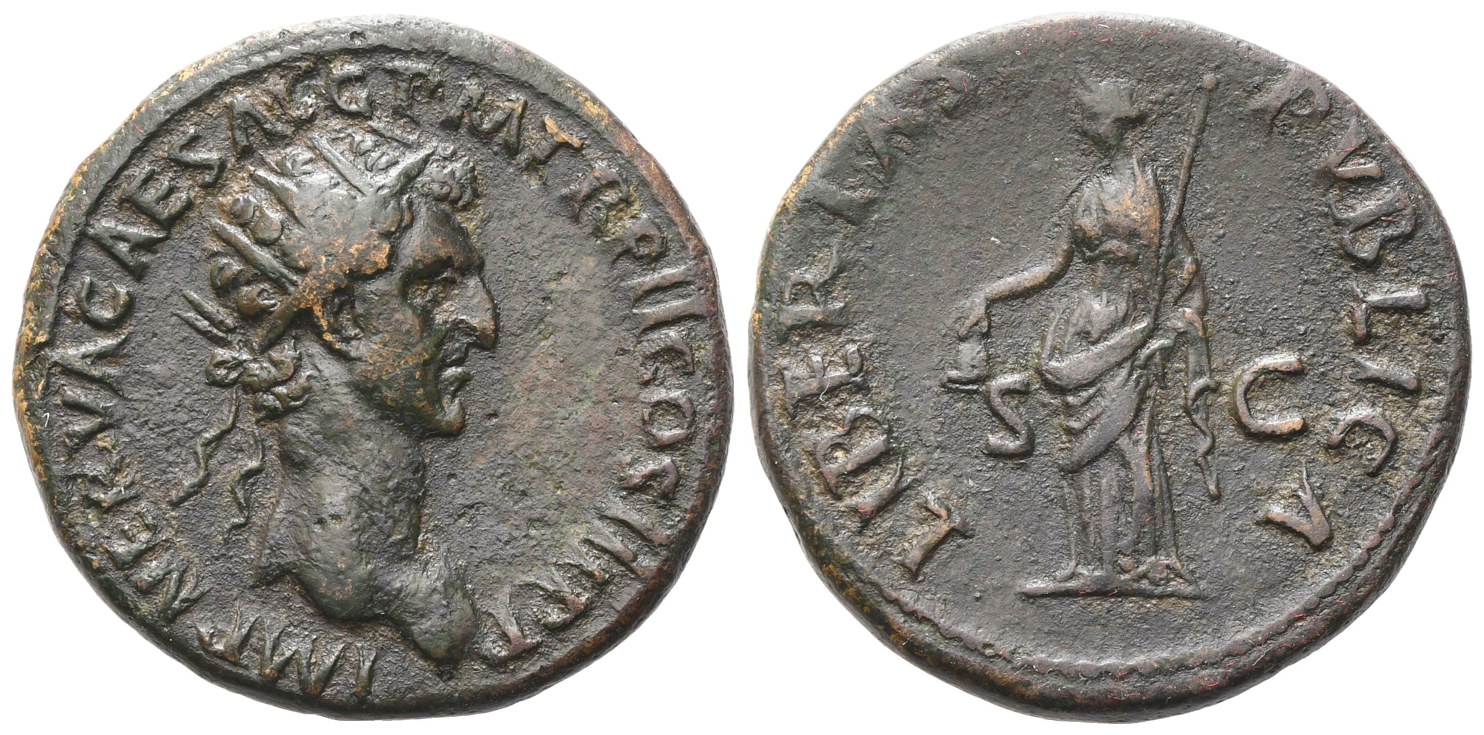 IMP NERVA CAES AVG P M TR P II COS III P P Radiate head r.; Rv. LIBERTAS - PVBLICA / S - C Libertas standing l. holding cap and sceptre. BM 138A. Paris 125. Cohen 120. RIC 101. Dark brown patina. Good very fine. Expressive portrait.