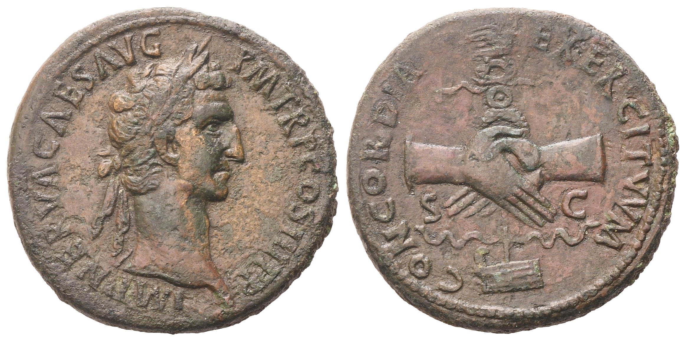 IMP NERVA CAES AVG P M TR P II COS III P P Laureate head r.; Rv. CONCORDIA EXERCITVVM, Clasped r. hands, holding aquila set on prow, S - C. RIC 96. Light brown patina with reddish hues. Good very fine.