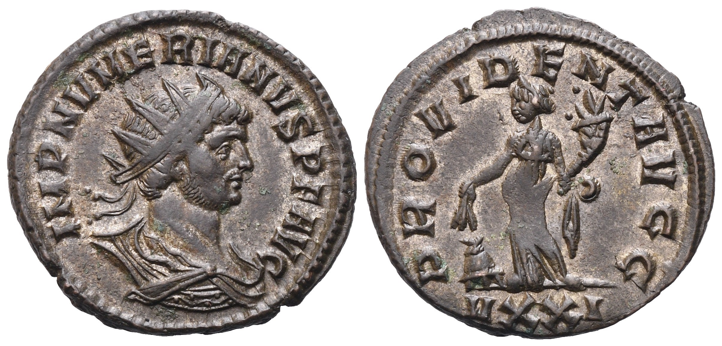 IMP NVMERIANVS P F AVG Radiate and cuirassed bust r.; Rv. PROVIDENT AVGG / VXXI Providentia standing l., holding cornucopia and grain ears over modius to l. RIC 447. Extremely fine.