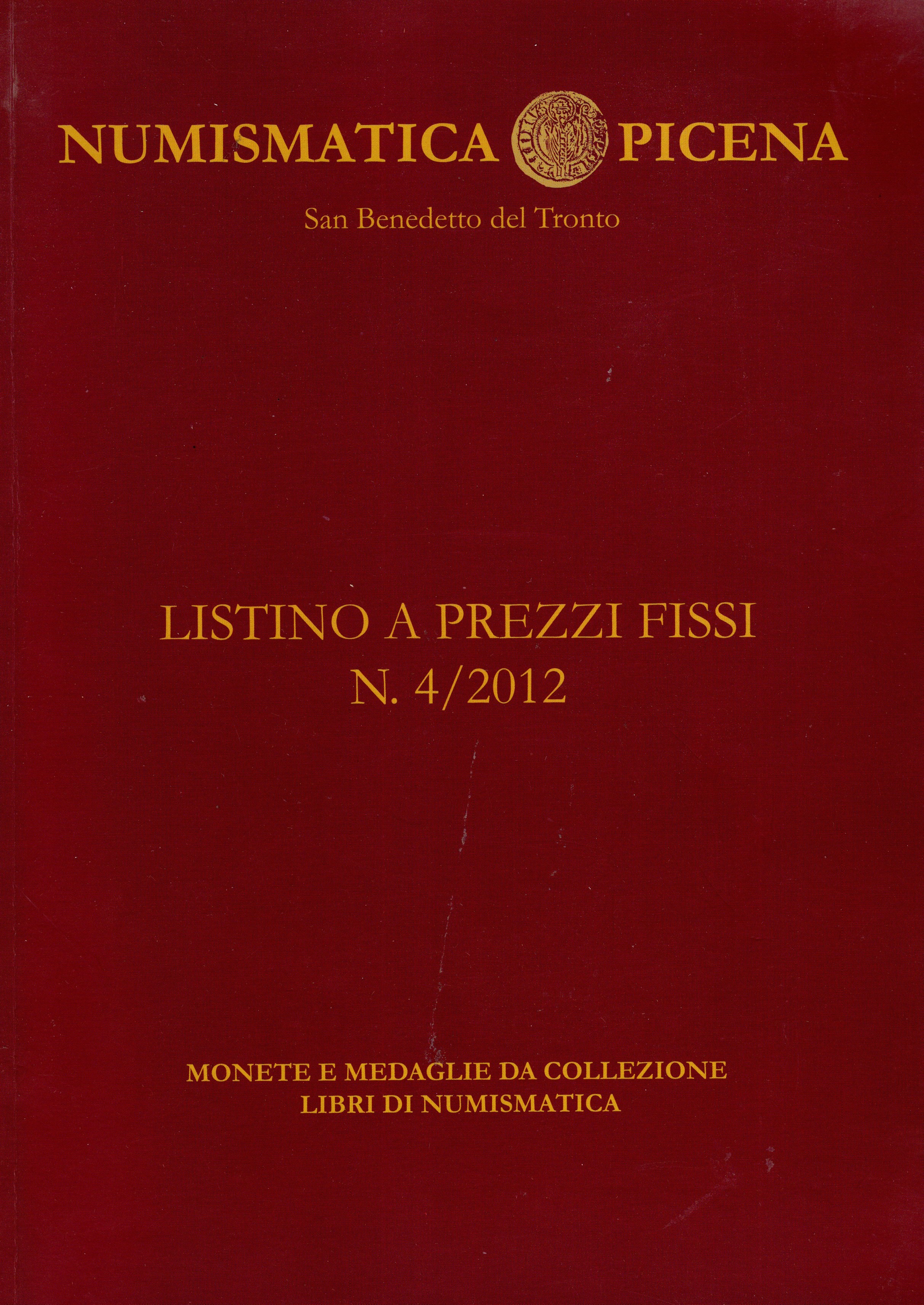NUMISMATICA PICENA - San Benedetto del Tronto. Listino a prezzi fissi N. 4. 2012. pp 119, nn. 910 + 41 di libri, tutti illustrati a colori nel testo. legatura ed. ottimo stato, ottima documentazione