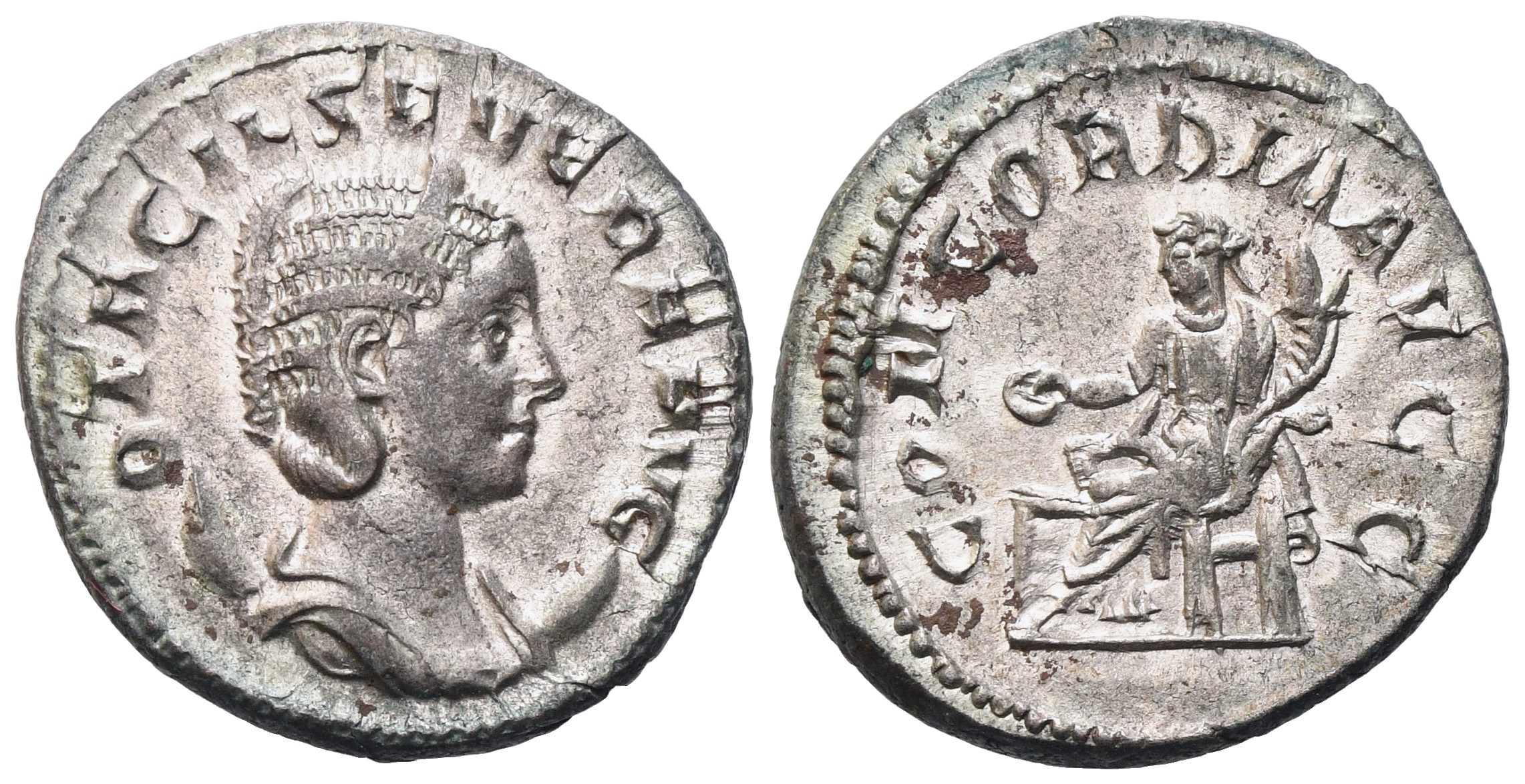 M OTACIL SEVERA AVG Diademed and draped bust of Otacilia Severa to r., set on a crescent; Rv. CONCORDIA AVGG Concordia seated l., holding patera in r. hand and double cornucopia in l.. Cohen 4. RIC 125c. Good very fine.