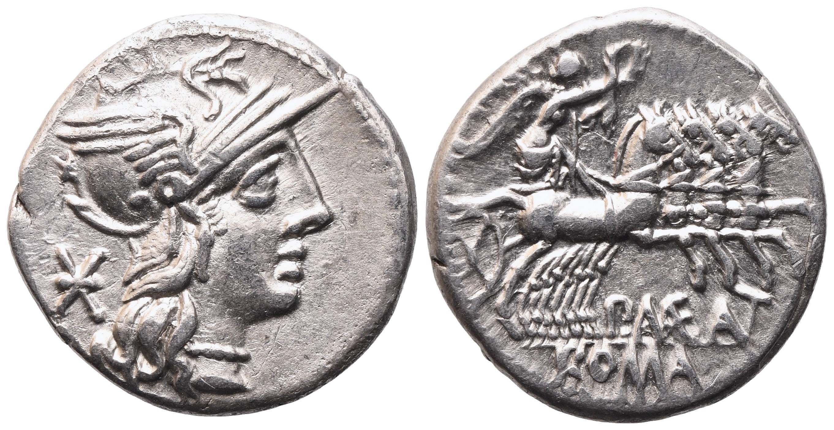 Helmeted head of Roma r.; behind, * (mark of value); Rv. Victory holding wreath in prancing quadriga r.; below, partially ligate, P·MAE ANT; in exergue, ROMA. Crawford 249/1; Babelon (Maenia) 7; Sydenham 492. EF. Lustrous.