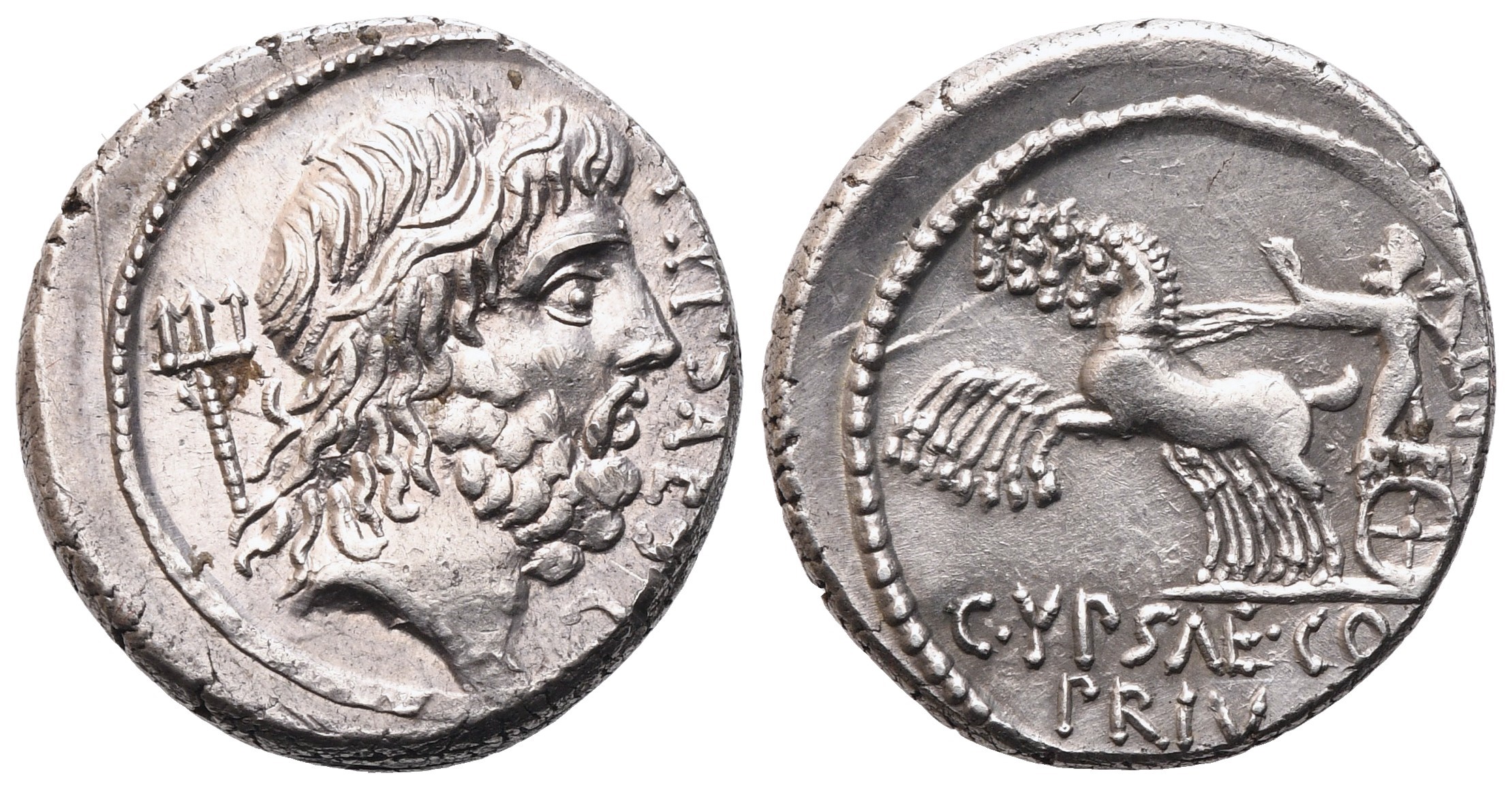 Head of Neptune r.; behind, trident; before, P YPSAE S C downwards; Rv. Jupiter in quadriga l., holding reins in l. hand and hurling thunderbolt with r. hand; below, C YPSAE COS / PRIV; behind, [CE]PIT upwards. Crawford 420/1a; BMCRR Roma 3841; B. Plautia 11; Sydenham 910. Extremely fine.