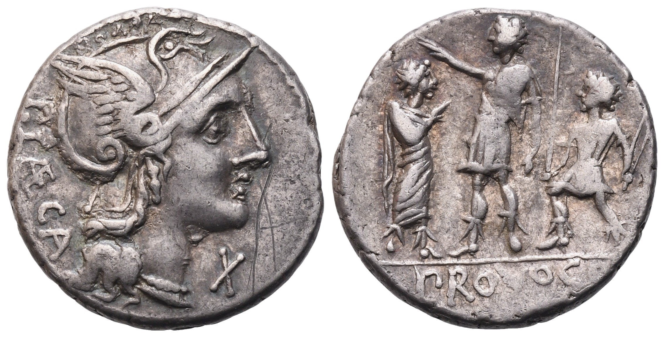 Helmeted head of Roma r.; above, ROMA; before, X (mark of value); behind, P LAECA; Rv. Figure in military dress l., with hand raised; on l., figure in toga; on r., attendant; in ex. PROVOCO. Crawford 301/1; Porcia 4; Sydenham 571. Good very fine.