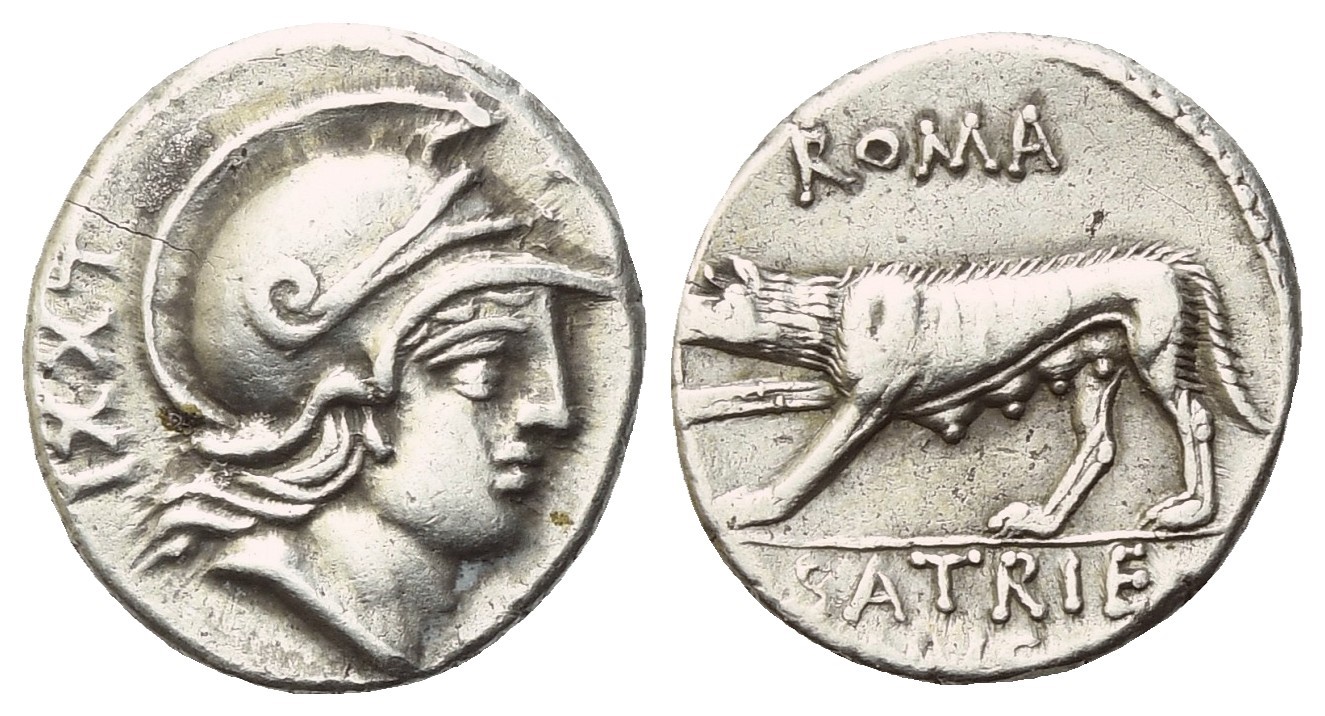 Helmeted head of Roma to right; behind, LXXI; Rv. She wolf l., r. forepaw raised; above, ROMA; in exergue, P·SATRIE / NVS. Crawford 388/1b; Babelon (Satriena) 1; Sydenham 781a. VF