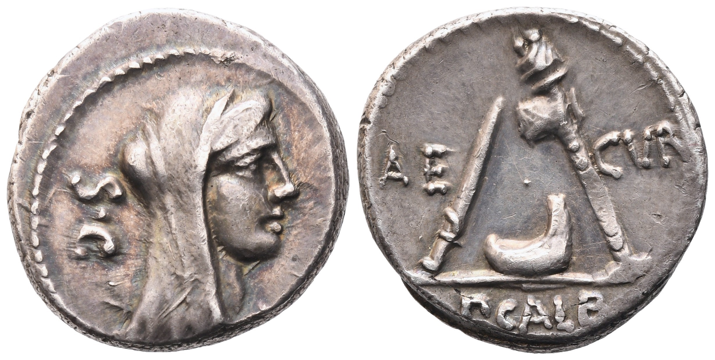 Veiled and diademed head of Vesta to r.; behind, S·C; Rv. Knife, culullus and axe; on l., AE; on r., CVR; in exergue, P·GALB. Crawford 406/1; Babelon (Sulpicia), 473; Sydenham 839. Very fine / good very fine. Nice iridescence.