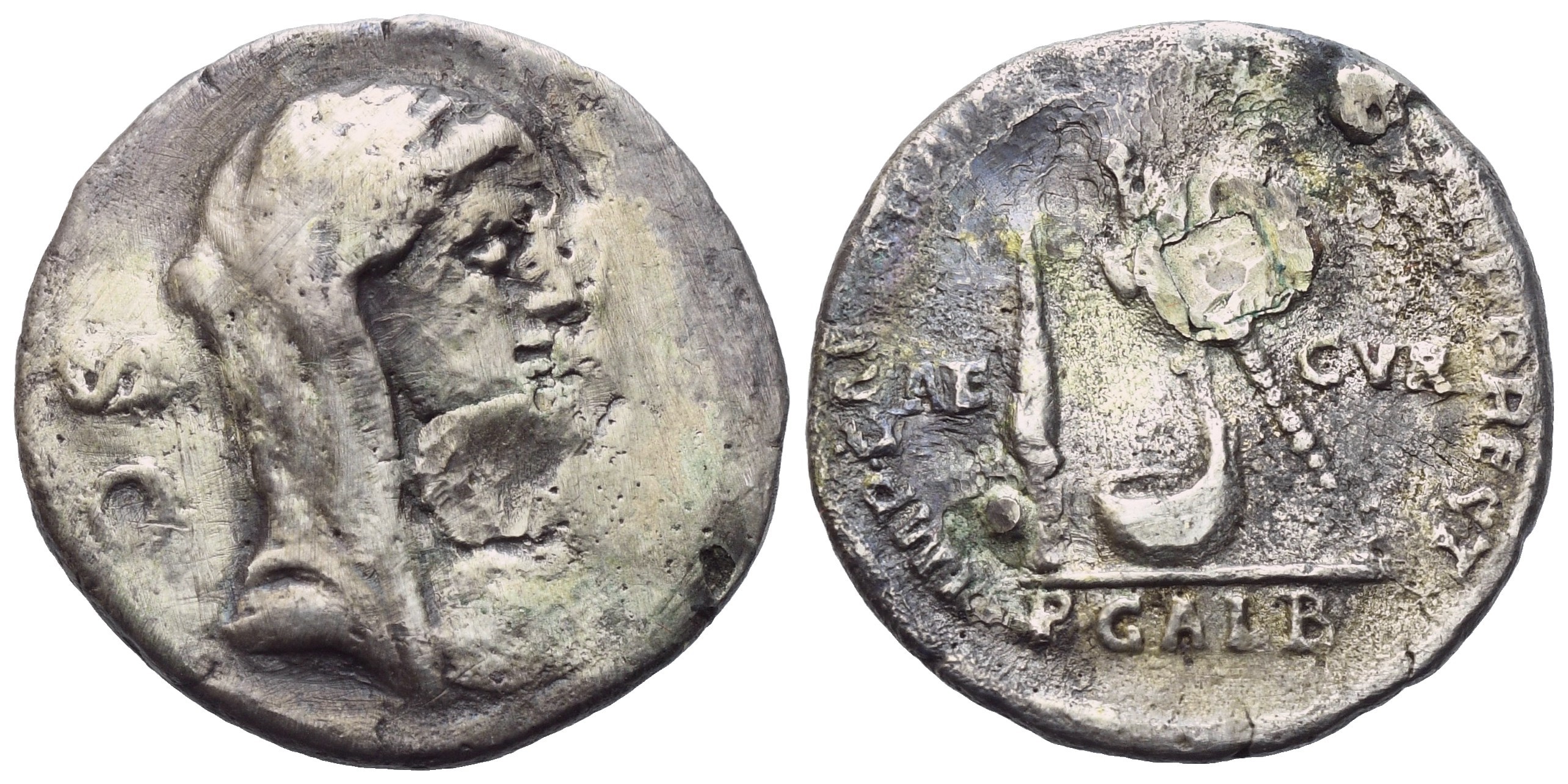 Veiled and diademed head of Vesta r.; behind, S·C; Rv. AED – CVR Knife, culullus and axe. In exergue, P·GALB. Babelon Sulpicia 6. Sydenham 839. RBW 1454. Crawford 406/1. VF