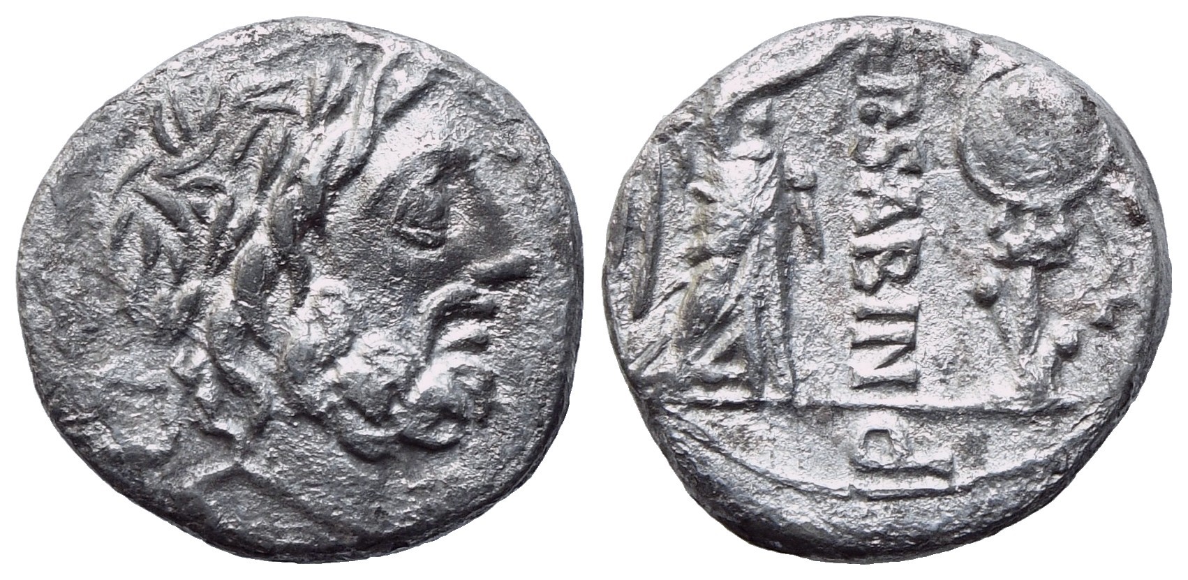 Laureate head of Jupiter r.; behind, uncertain control letter; Rv. Victory r., crowning trophy; between, P·SABIN downwards; on r., control letter; in exergue, Q. Crawford 331/1; Babelon (Vettia) 1; Sydenham 587. gVF