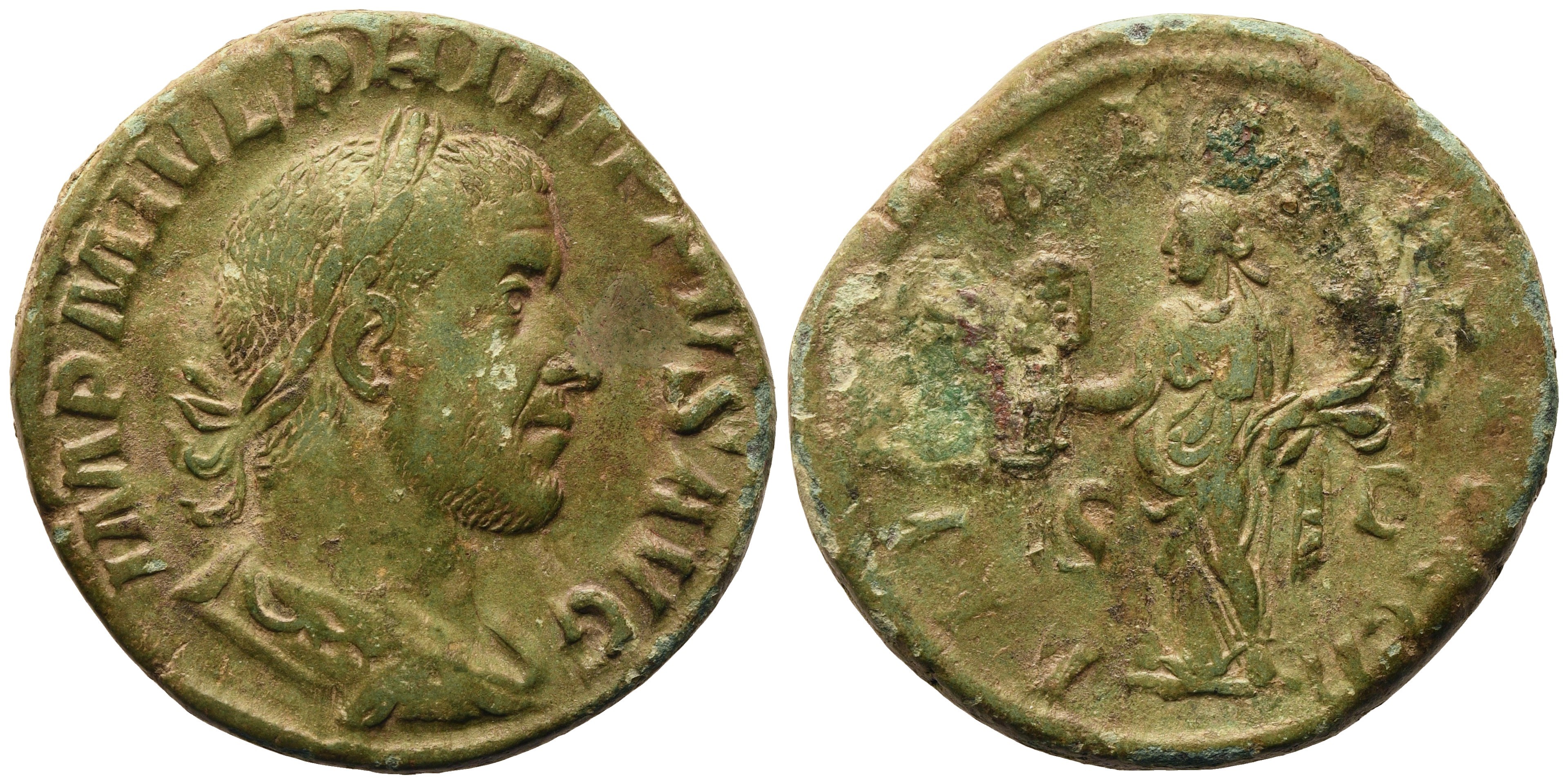 IMP M IVL PHILIPPVS AVG Laureate, draped and cuirassed bust r.; Rv. LIBERALITAS AVGG II, Liberalitas standing left, holding abacus and cornucopiae; S-C across fields. RIC 180a. Green patina with red hues. Good very fine.