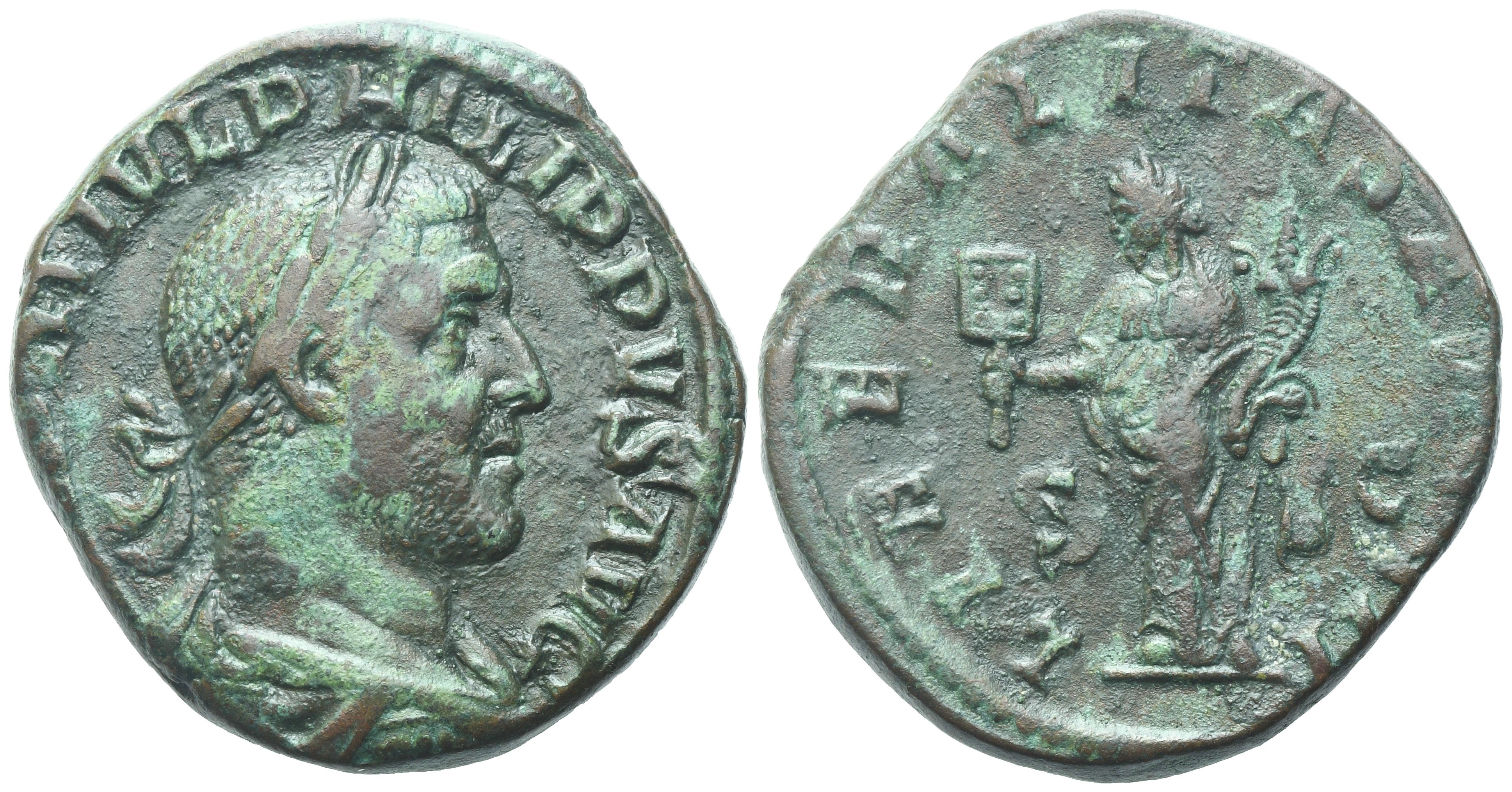 IMP M IVL PHILIPPVS AVG Laureate, draped and cuirassed bust r.; Rv. LIBERALITAS AVG Liberalitas standing l., holding abacus and cornucopiae; S-C across fields. RIC 180a. Nice green patina. Good very fine.