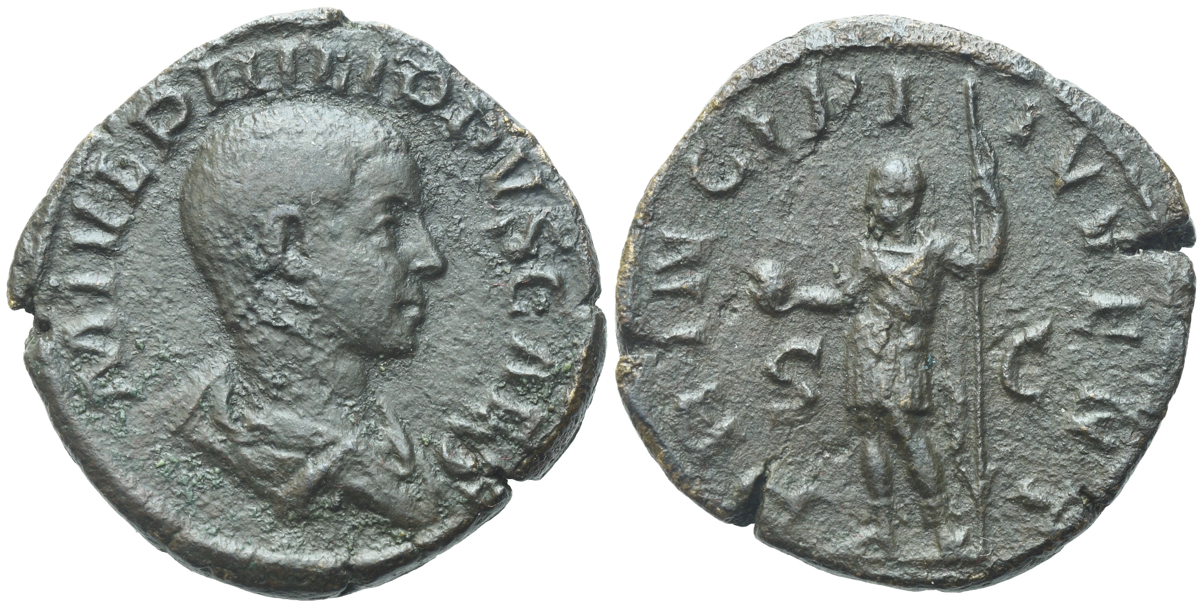 M IVL PHILIPPVS CAES Bare-headed and draped bust to r.; Rv. PRINCIPI IVVENT Prince standing to l., holding globe and spear; S-C across fields. ARIC 256a. Grey-green patina. Good very fine.