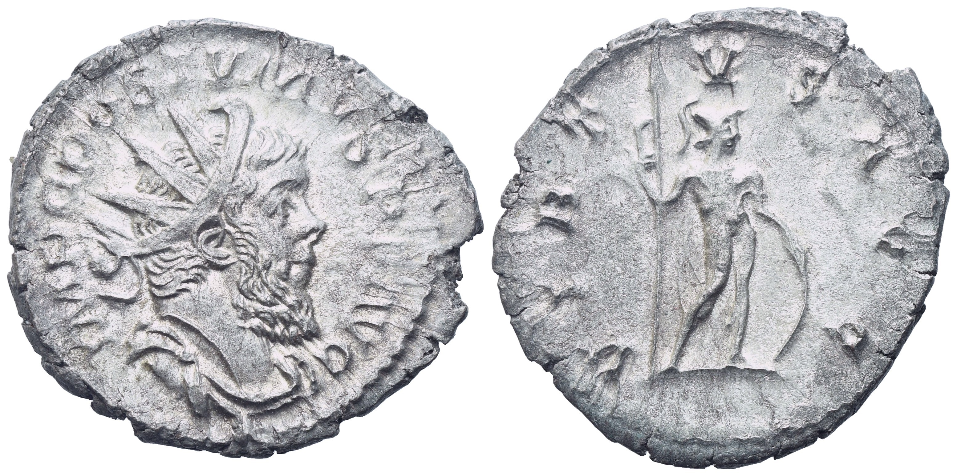 IMP C POSTVMVS P F AVG Radiate, draped and cuirassed bust of Postumus r.; Rv. VIRTVS AVG Mars standing facing, head r., holding spear in his r. hand and placing his l. hand on shield set on ground. RIC 207; Elmer 190. Good very fine / very fine.