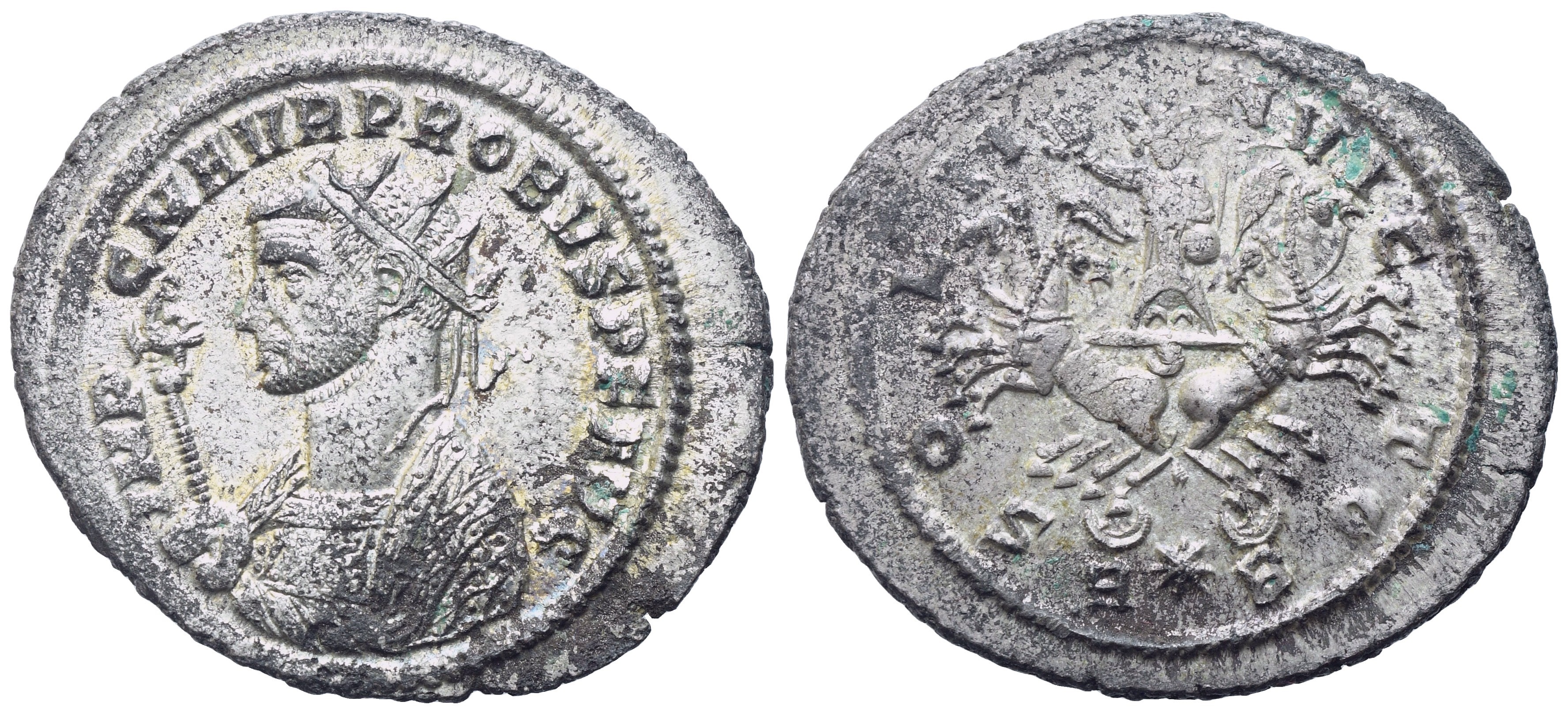 IMP C M AVR PROBVS P F AVG Radiate and mantled bust to l., holding eagle-tipped sceptre and globe; Rv. SOLI INVICTO Sol in spread quadriga, holding whip; R*B in exergue. RIC V.2 204. Good very fine.