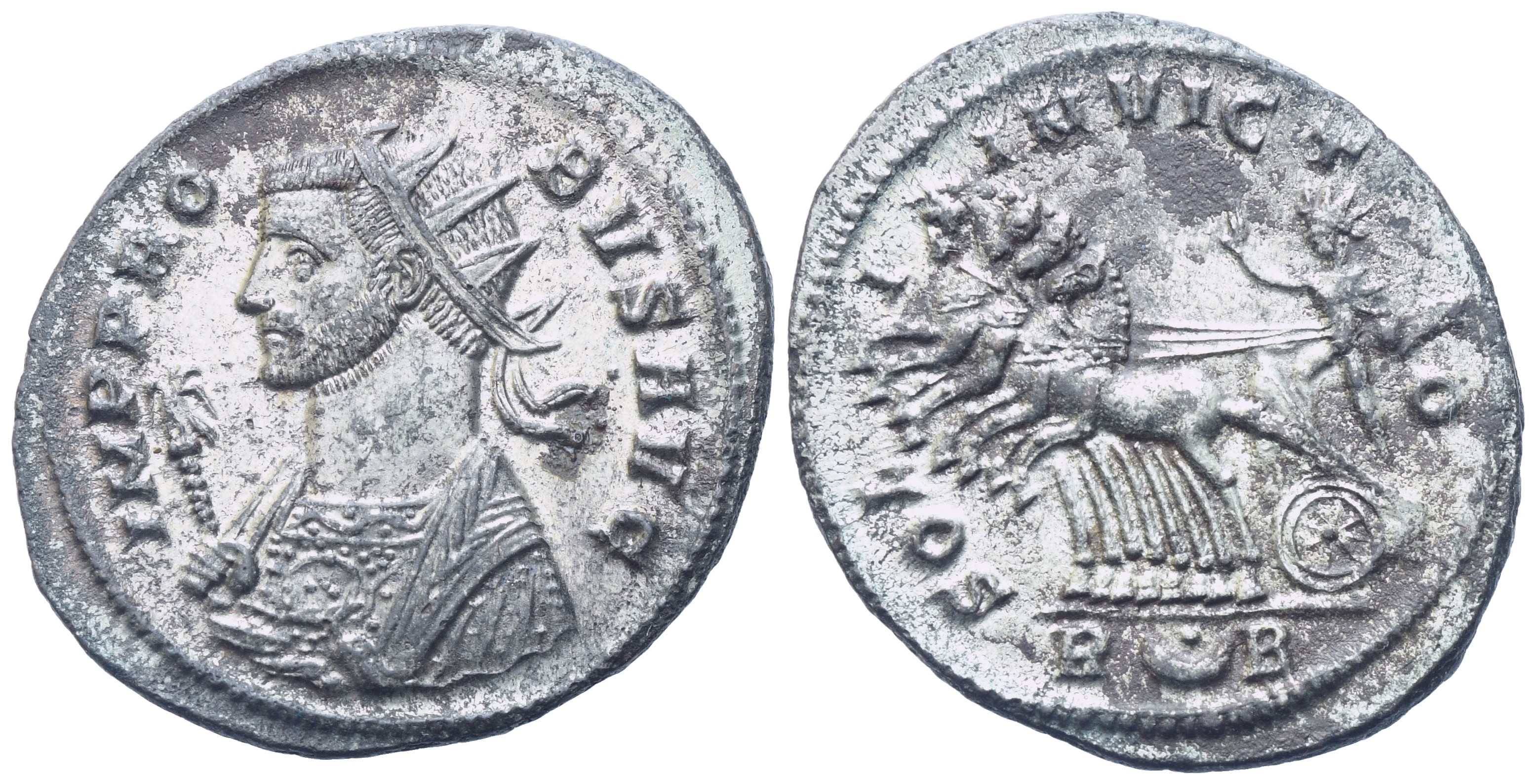 IMP PROBVS AVG, Radiate bust to l., in imperial mantle, holding eagle-tipped sceptre; Rv. SOLI INVICTO, Sol driving quadriga l., holding whip and globe and raising hand; R (crescent) E in exergue. RIC 202. Near extremely fine.