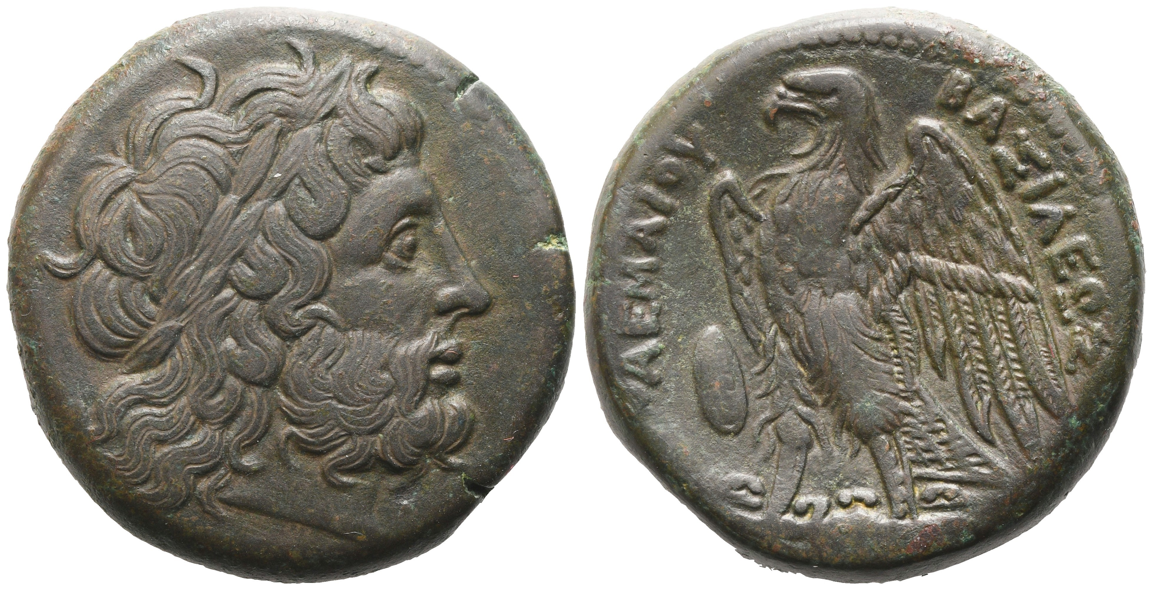 Laureate head of Zeus r.; dotted border; Rv. Eagle standing l. on thunderbolt; shield to l.; dotted border. CPE B289; Svoronos 610; Wolf & Lorber, 'Alexandrian' Style, P01β56; SNG Copenhagen 114. Dark brown patina. Good extremely fine.