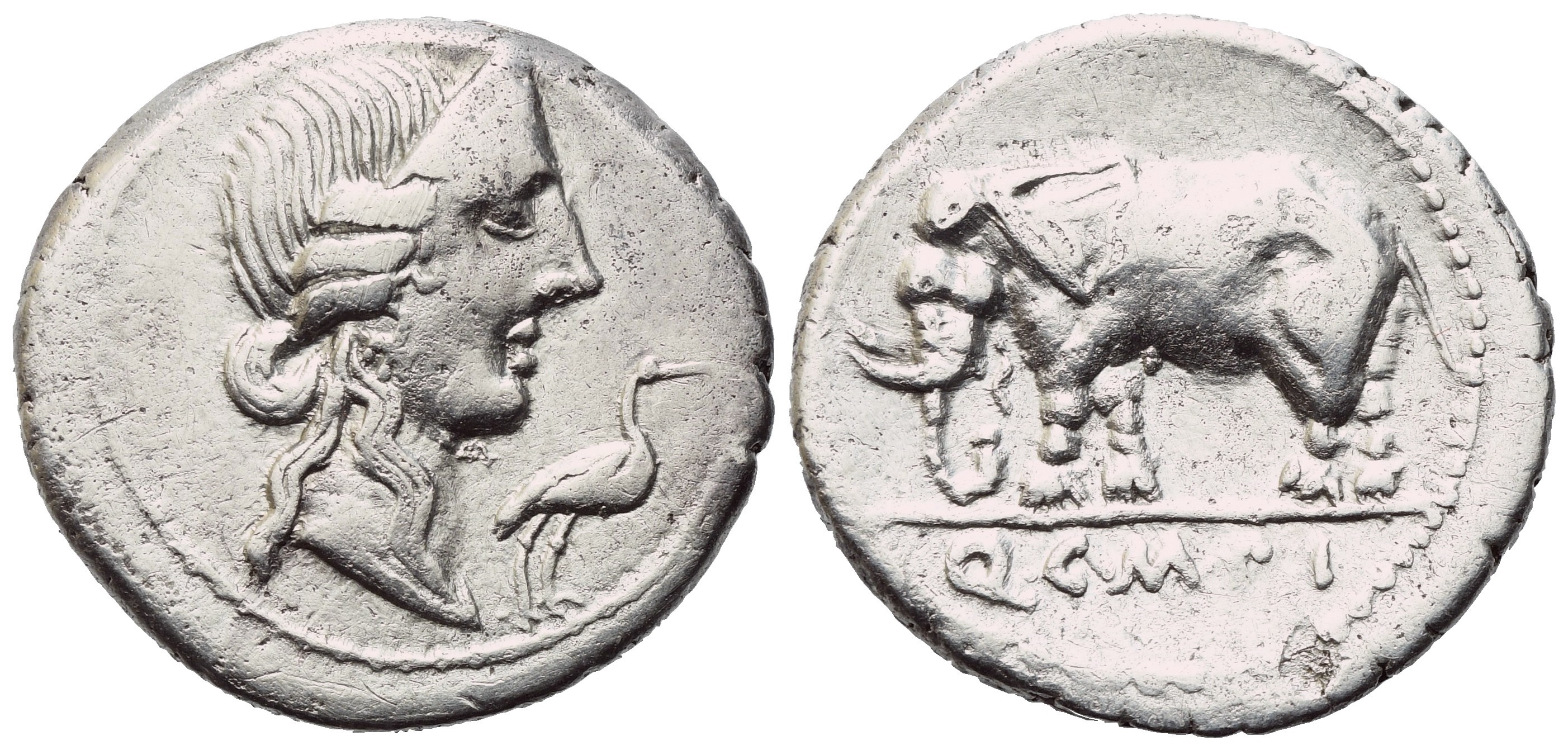 Diademed head of Pietas r.; before, stork standing r.; Rv. Elephant walking l.; in exergue, Q·C·M·PI. Crawford 374/1; Babelon (Caecilia) 43; Sydenham 750. Good very fine.