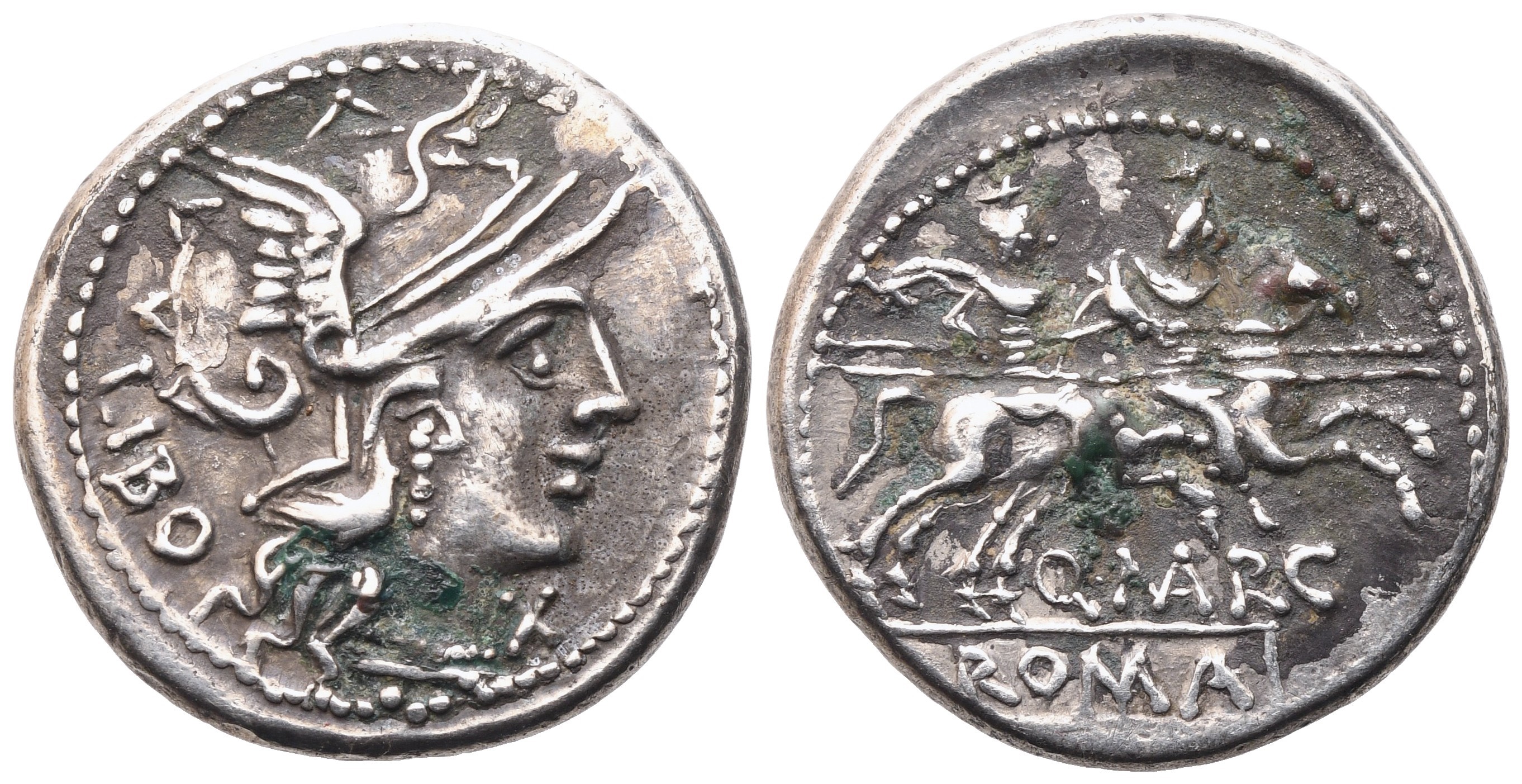 Head of Roma to r., wearing crested and winged helmet; to r., X (mark of value); behind, LIBO; Rv. Dioscuri, each holding spear, on horseback galloping r,; above their heads, two stars; below, partially ligate, Q·MARC; in linear frame, ROMA. Crawford 215/1; Babelon (Marcia) 1; Sydenham 395. Very fine.