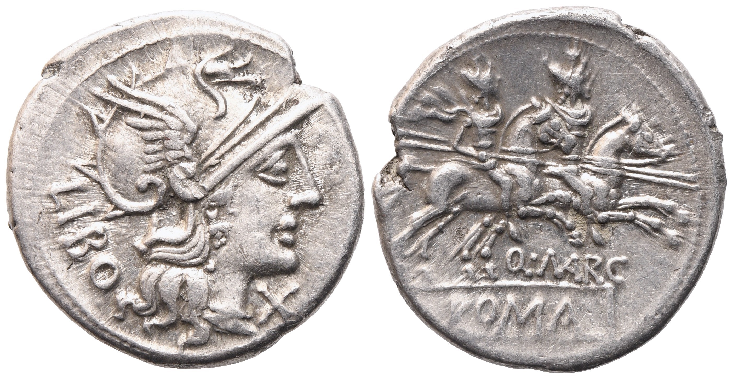Head of Roma to r., wearing crested and winged helmet; to r., X (mark of value); behind, LIBO; Rv. Dioscuri, each holding spear, on horseback galloping r,; above their heads, two stars; below, partially ligate, Q·MARC; in linear frame, ROMA. Crawford 215/1; Babelon (Marcia) 1; Sydenham 395. Good very fine.