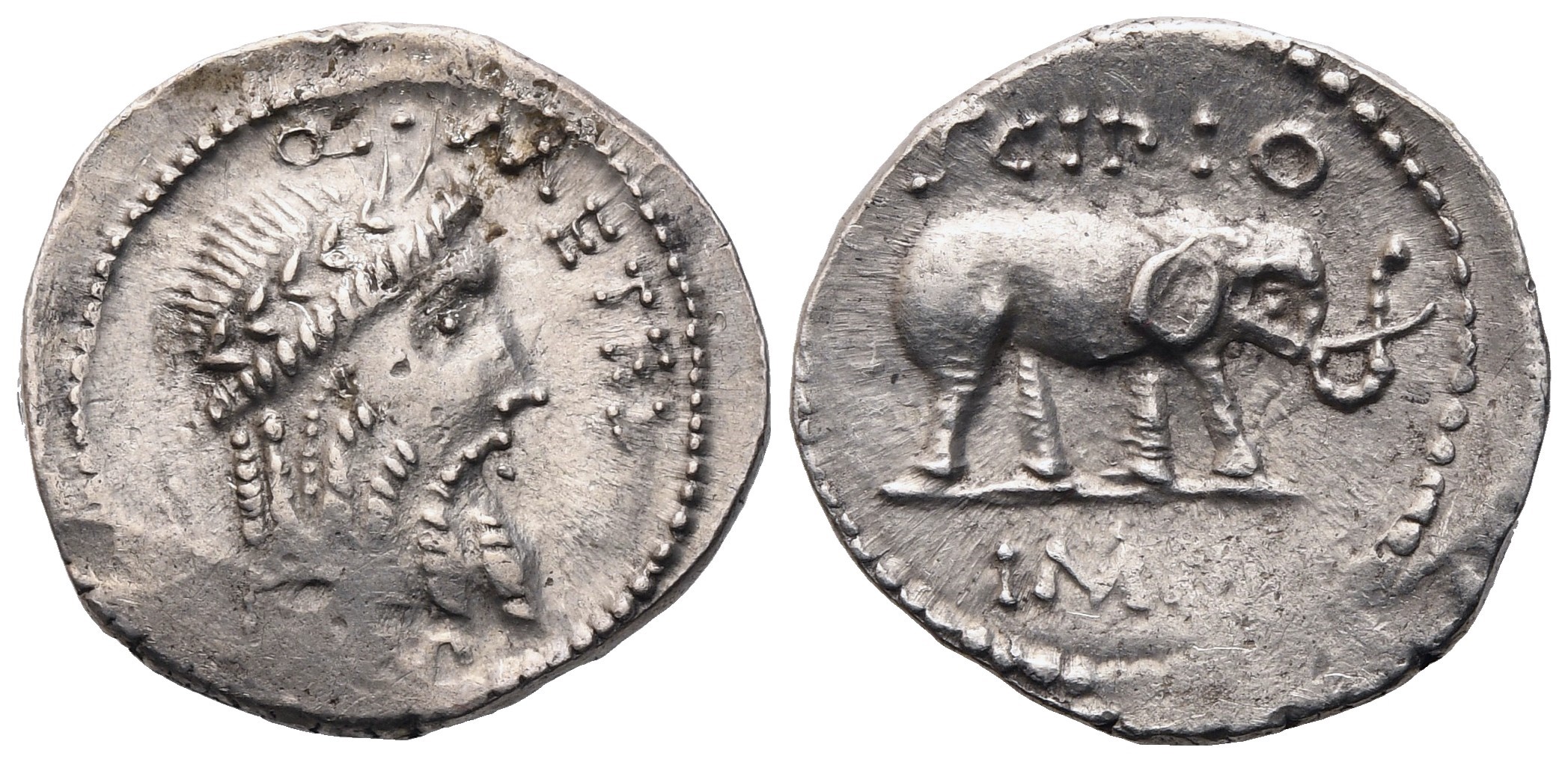Military mint traveling with Scipio in Africa. Laureate head of Jupiter r., Q·METEL above, PIVS below; Rv. Elephant advancing r.; SCIPIO above, IMP in exergue. Crawford 459/1; Babelon (Caecilia) 47; Sydenham 1050. Some areas of flatness, otherwise good very fine.