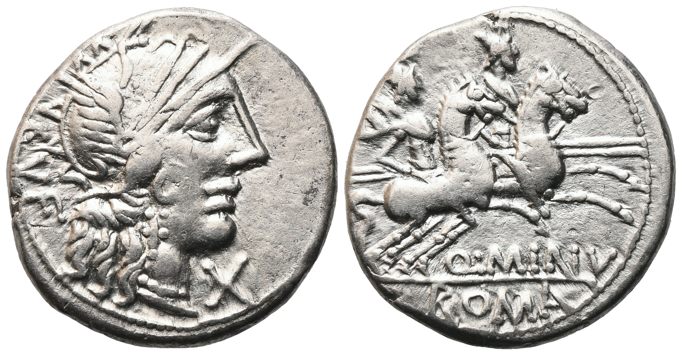 Helmeted head of Roma to right; behind, RVF downwards; before, X (mark of value); Rv. Dioscuri riding on horseback to r.; below, Q·MINV; in exergue, ROMA. Crawford 277/1; Babelon (Minucia) 1; Sydenham 421. Extremely fine. Lustrous.