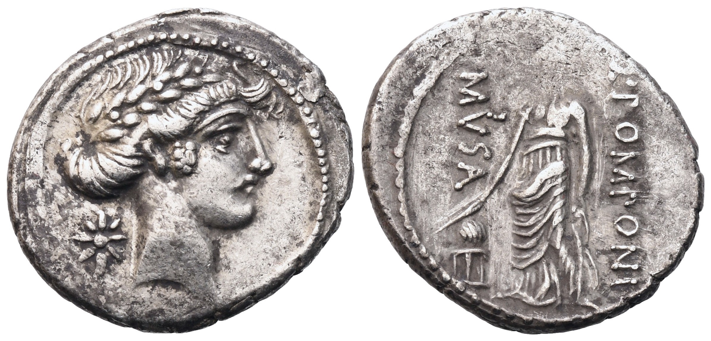 Laureate head of Apollo r.; behind, star; Rv. Q POMPONI MVSA Urania, the Muse of Astronomy, standing facing, head l., holding wand pointed toward sphere set on tripod to l. Crawford 410/8; Sydenham 823; Pomponia 22. Good very fine.