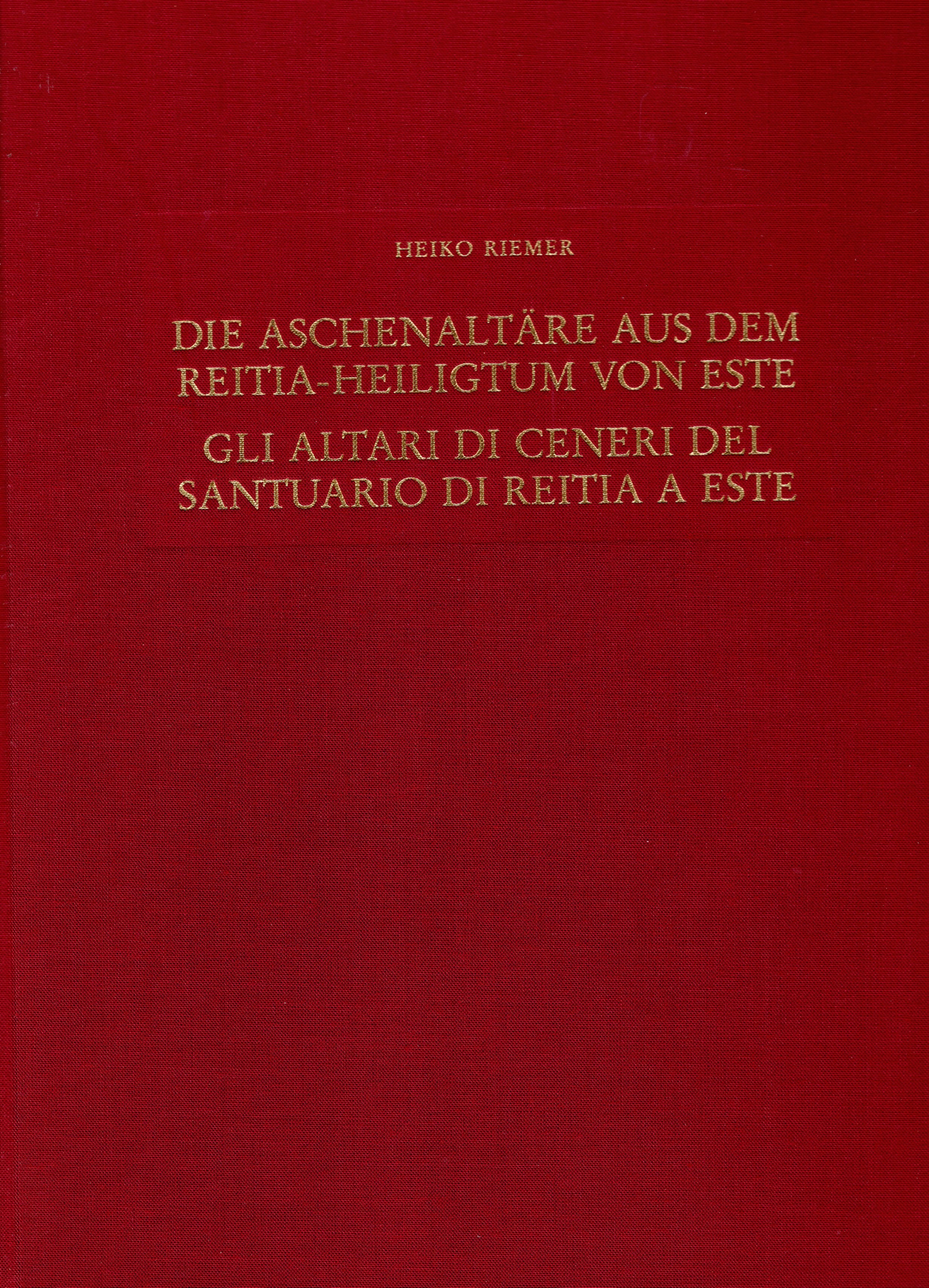 RIEMER Heiko. Gli altari di ceneri del Santuario di Reitia a Este. Mainz am Rhein, 2005. pp 429, tavv. 28, + illustrazioni nel testo + 3 carte. Rilegatura eidtoriale, ottimo stato. testo in tedesco e
