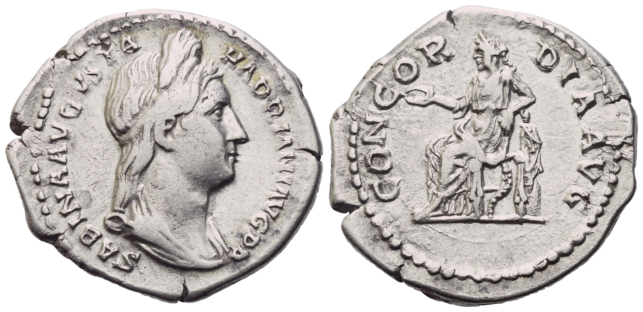SABINA AVGVSTA HADRIANI AVG P P Draped bust r.; Rv. CONCORDIA AVG Concordia seated l. on throne, holding patera and resting elbow upon statue of Spes; cornucopia below throne. RIC² 2501. Good very fine / about extremely fine. Nice lustre.