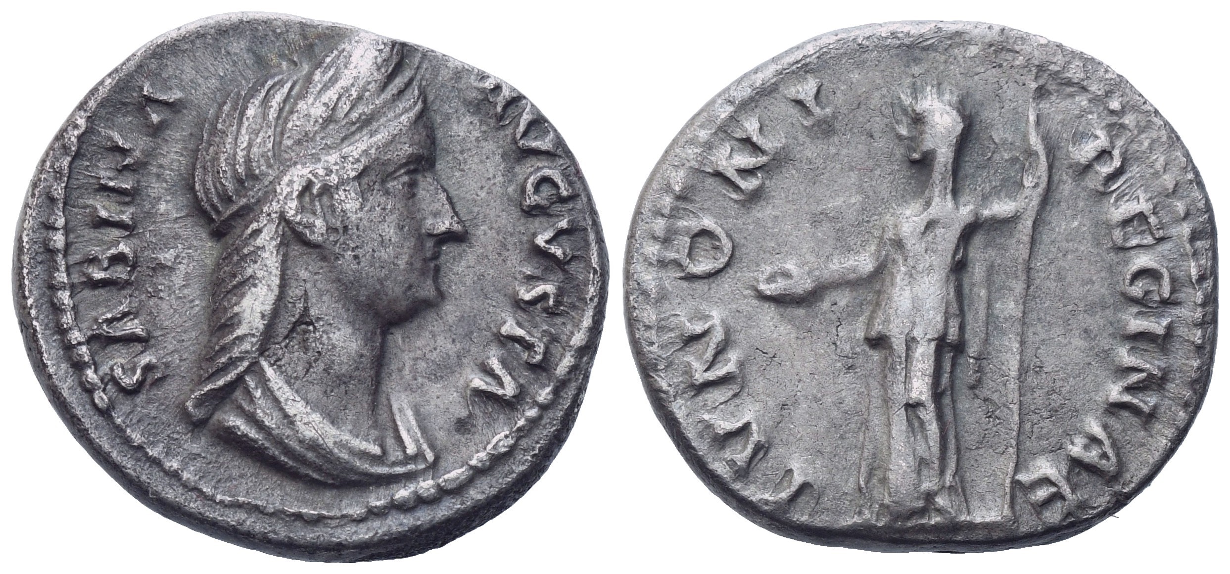 SABINA AVGVSTA Draped bust r.; Rv. IVNONI REGINAE Juno standing l. holding patera and sceptre. RIC 395a. Almost gVF