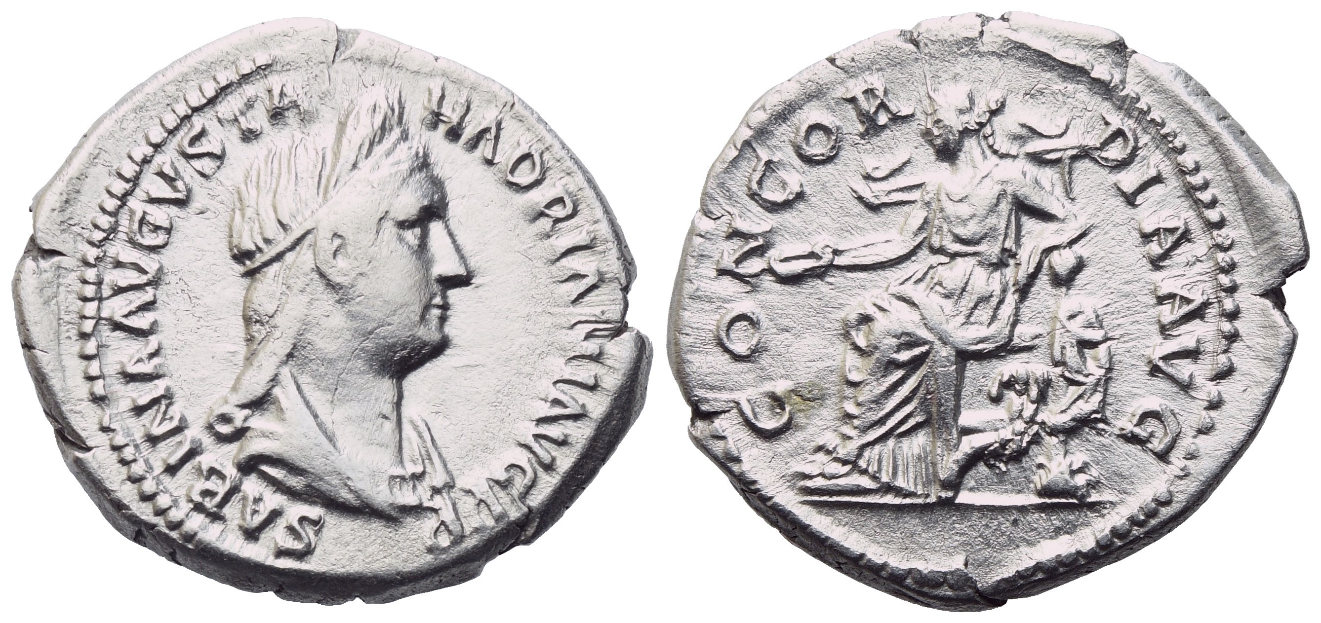 SABINA AVGVSTA HADRIANI AVG P P Draped bust r.; Rv. CONCORDIA AVG Concordia seated l. on throne, holding patera and resting elbow upon statue of Spes; cornucopia below throne. RIC² 2501. Good very fine / near extremely fine. Lustrous specimen.
