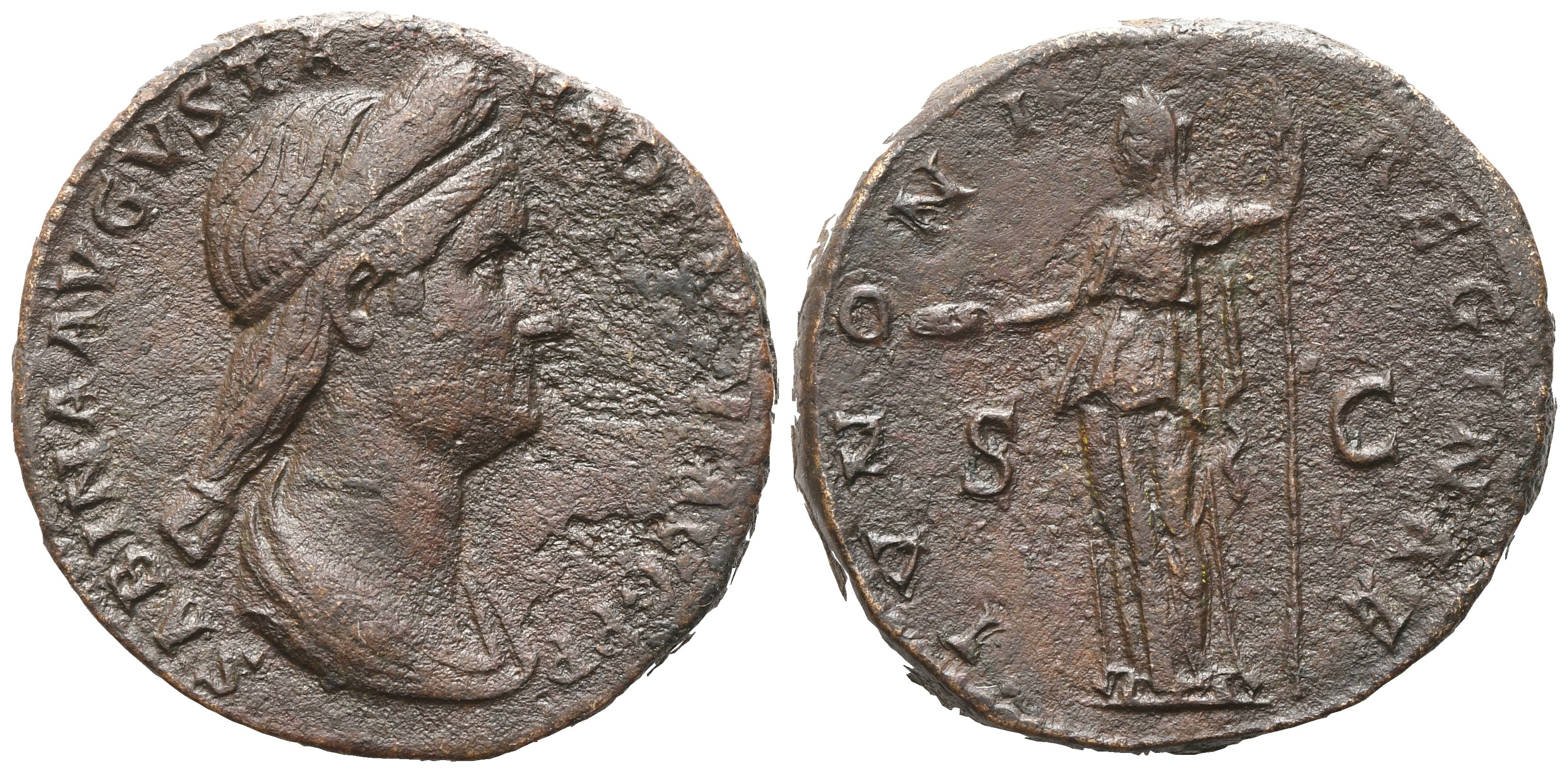SABINA AVGVSTA HADRIANI AVG P P Diademed and draped bust of Sabina to r.; Rv. IVNONI REGINAE / S - C Juno standing front, head to l., holding patera in her r. hand and long sceptre in her l. BMC 1869. Cohen 38. RIC 1028. Dark brown patina. Very fine.