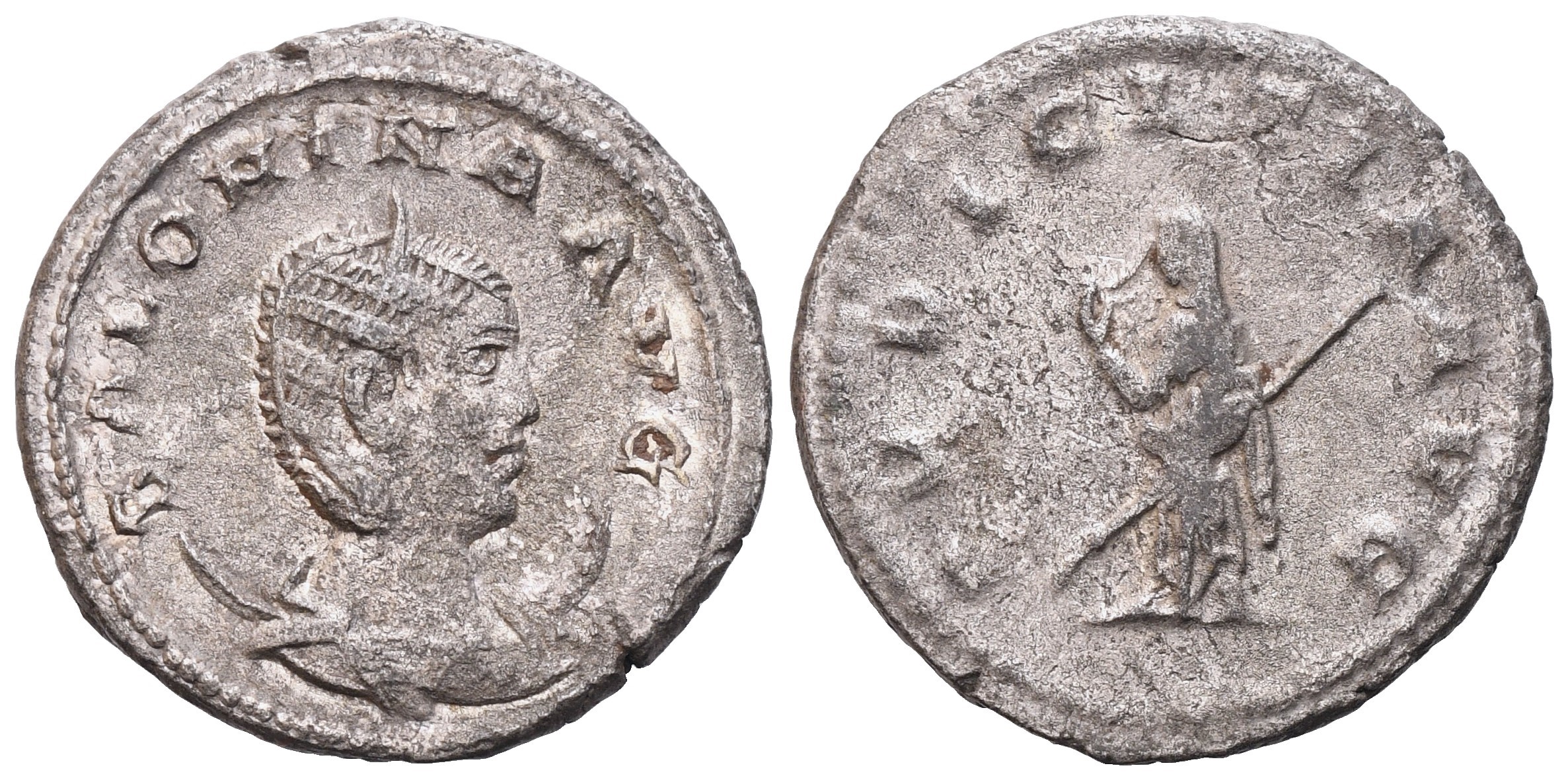 SALONINA AVG Diademed and draped bust of Salonina set to r. on crescent; Rv. PVDICITIA, Pudicitia standing l., raising veil from face and holding transverse sceptre. Cohen 92. RIC V.1 24. VF