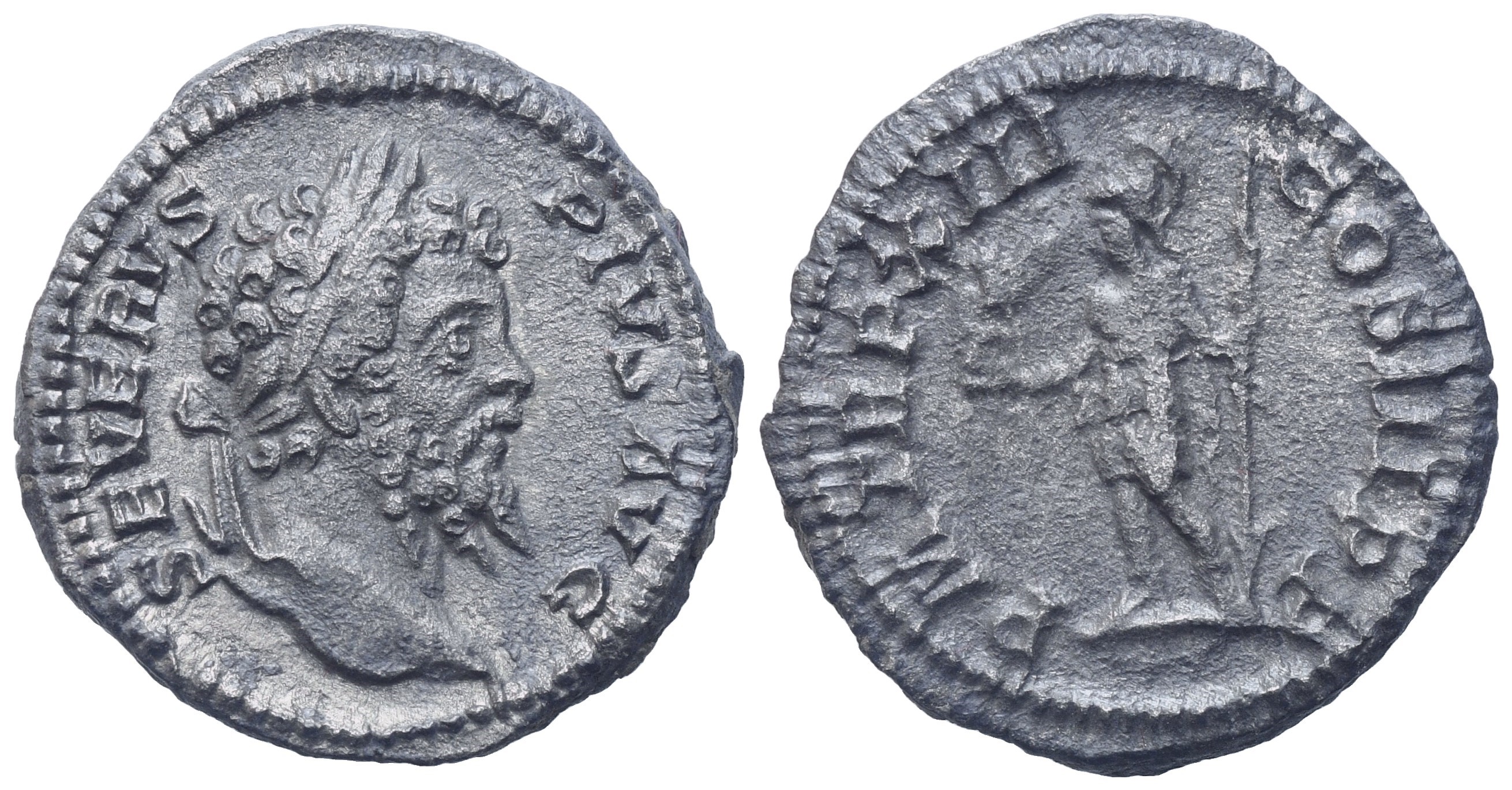 SEVERVS PIVS AVG Laureate head r.; Rv. PM TRP XIII COS III PP Roma standing l. holding Victory and spear. RIC 197; BMCRE 474; RSC 471. gVF