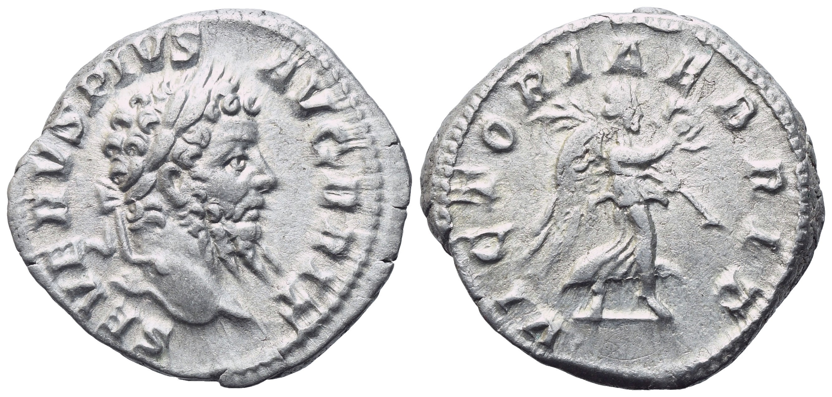 SEVERVS PIVS AVG BRIT Laureate head r.; Rv. VICTORIAE BRIT Victory standing r. holding wreath and palm. RIC IV, 332. Good very fine. Lustrous.