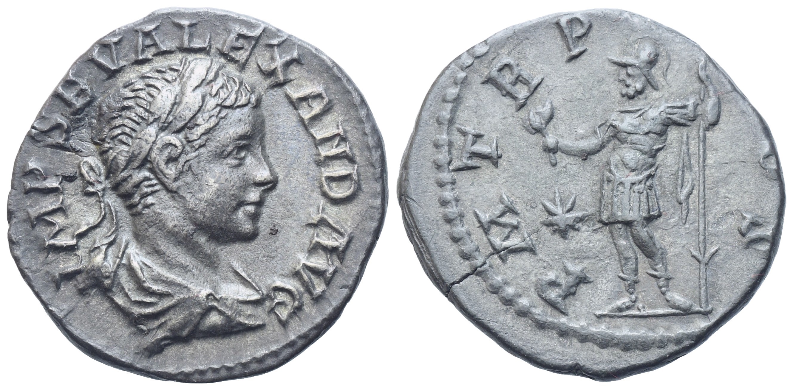 IMP C M AVR SEV ALEXAND AVG, laureate and draped bust to right. Rev.: P M TR P II COS P P, Mars standing to left, holding olive-branch and reversed spear. RIC 23; BMCRE 92; RSC 231. Crack at 8 o'clock on the obverse, otherwise good very fine.