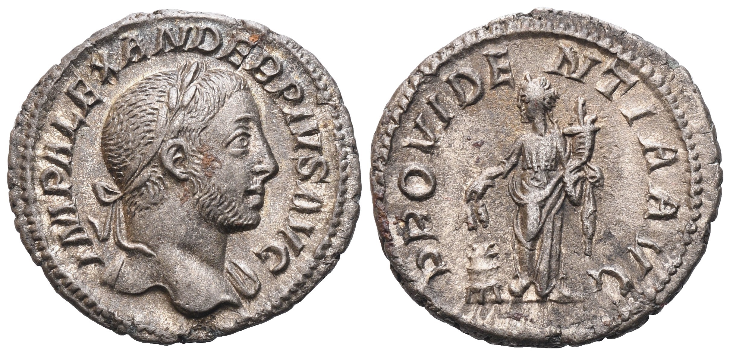 IMP ALEXANDER PIVS AVG Laureate head r.; Rv. PROVIDENTIA AVG Providentia standing front, head to l., holding two grain ears in her r. hand and cornucopia with her l.; on ground to l., modius. RIC 250. Near extremely fine.