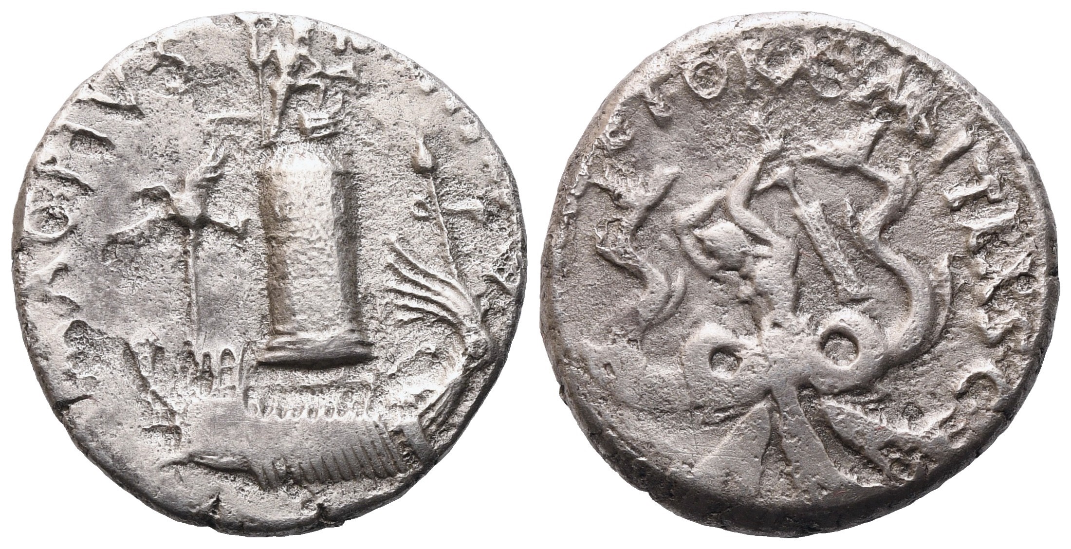 Uncertain mint in Sicily. Galley with aquila on prow and sceptre tied with fillet on stern; in the background, pharus of Messana surmounted by statue of Neptune, holding trident and rudder, placing l. foot on prow; around, MAG·PIVS – [IMP ITER]; Rv. Sea monster Scylla wielding rudder with both hands; around, partially ligate, [PRÆ]F·ORÆ·MARI]T·EX·S·C. Crawford 511/4a; Babelon (Pompeia) 22; Sydenham 1348. Very fine.